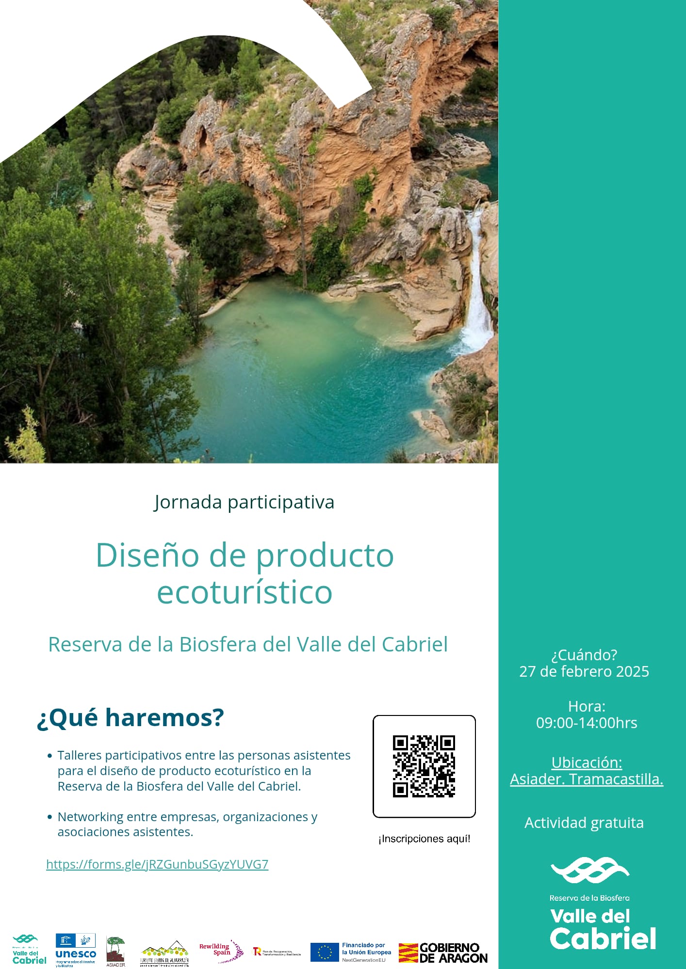 La Asociación de la Reserva de la Biosfera del Valle del Cabriel, con la colaboración de Asiader, la Asociación de Empresarios Turísticos de la Sierra de Albarracín y Rewilding Spian, invita a todas las empresas del sector turístico, oficinas de turismo, Centros de Interpretación, asociaciones y organismos interesados a colaborar en una jornada participativa el próximo 27 de febrero, de 9:00 a 14:00 horas, en la sede de Asiader, Tramacastilla. El objetivo de este encuentro es diseñar nuevas experiencias ecoturísticas que potencien el territorio de manera sostenible y refuercen su atractivo como destino de naturaleza.