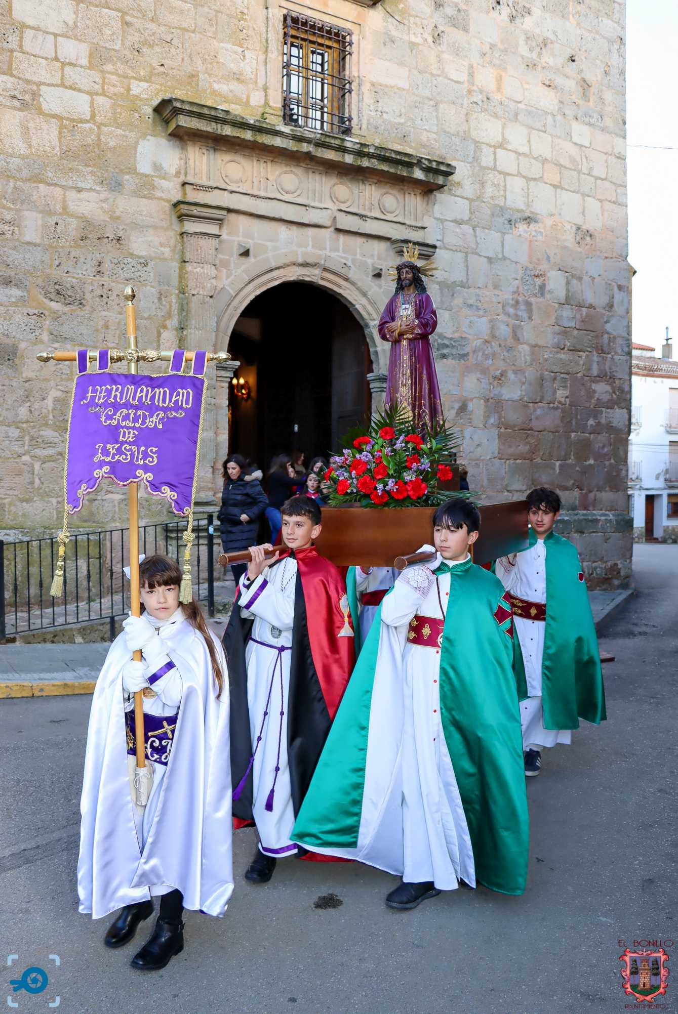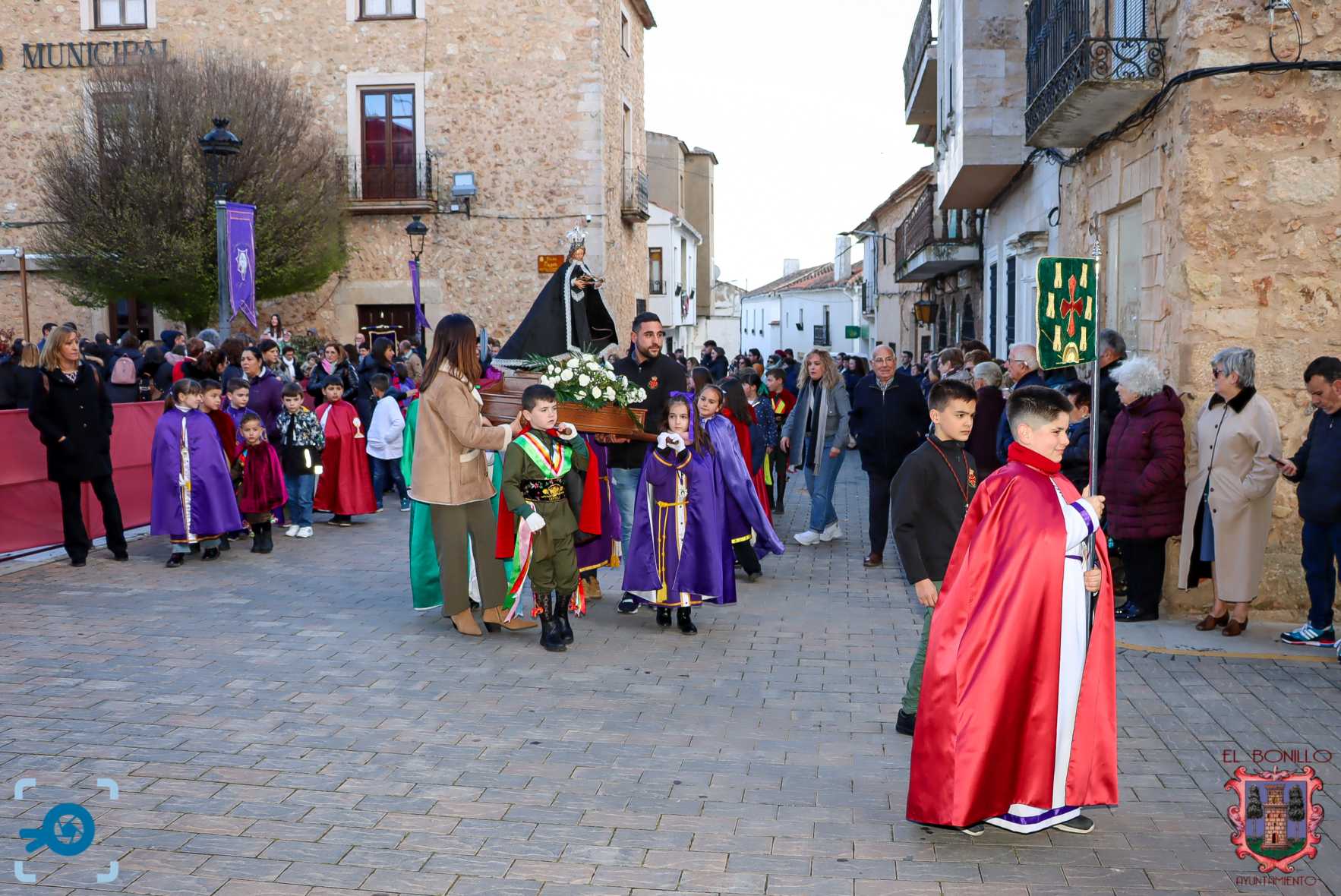 El Bonillo vivió ayer martes una jornada dedicada a la Semana Santa Infantil, en la que la lluvia terminó restando protagonismo a los pequeños cofrades. A las 18:30 horas, y con la incertidumbre del tiempo como telón de fondo, dio comienzo la Procesión de Niños y Jóvenes, en la que participaron más de un centenar de niños, acompañados por la Banda de la Cofradía de la Caída de Jesús.