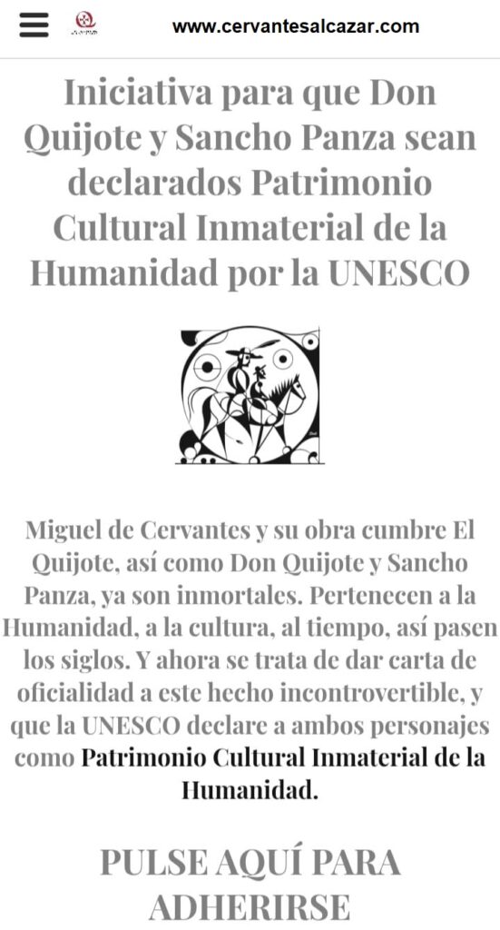 Ya está más cerca la declaración puesto que se ha iniciado el camino de darle forma al dossier y se ha abierto la posibilidad de recibir adhesiones públicas y privadas. La acogida de esta iniciativa por los medios de comunicación españoles y extranjeros ha sido espectacular. Después de que una infinidad de diarios y medios digitales tanto de España como internacionales se hicieran eco de la noticia y después de que personas de la Junta Directiva hayan mantenido diferentes entrevistas en medios audiovisuales (radio y televisión), los miembros de la Sociedad Cervantina de Alcázar se encuentran trabajando de lleno en la elaboración de un dossier lo más amplio posible que respalde la petición de que don Quijote y Sancho Panza sean declarados Patrimonio Cultural de la Humanidad.