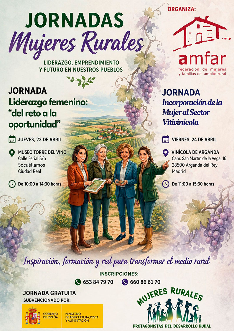 Con el objetivo de transformar los retos actuales en oportunidades de emprendimiento para las mujeres, AMFAR, la Federación de Mujeres y Familias del Ámbito Rural ha organizado dos jornadas clave dedicadas al liderazgo femenino y la profesionalización de las mujeres en el sector vitivinícola que tendrán lugar en Socuéllamos (Ciudad Real) y Arganda del Rey (Madrid), ofreciendo un espacio de aprendizaje y networking totalmente gratuito para las asistentes.