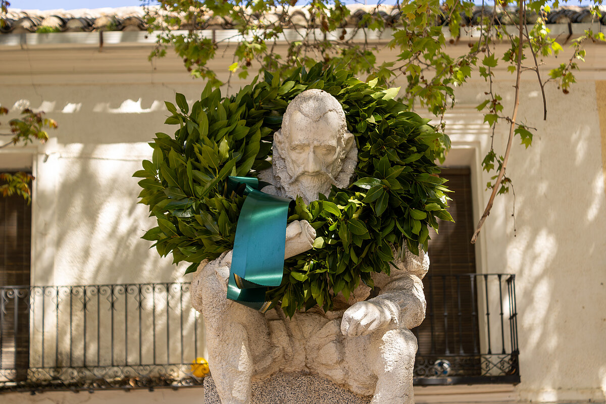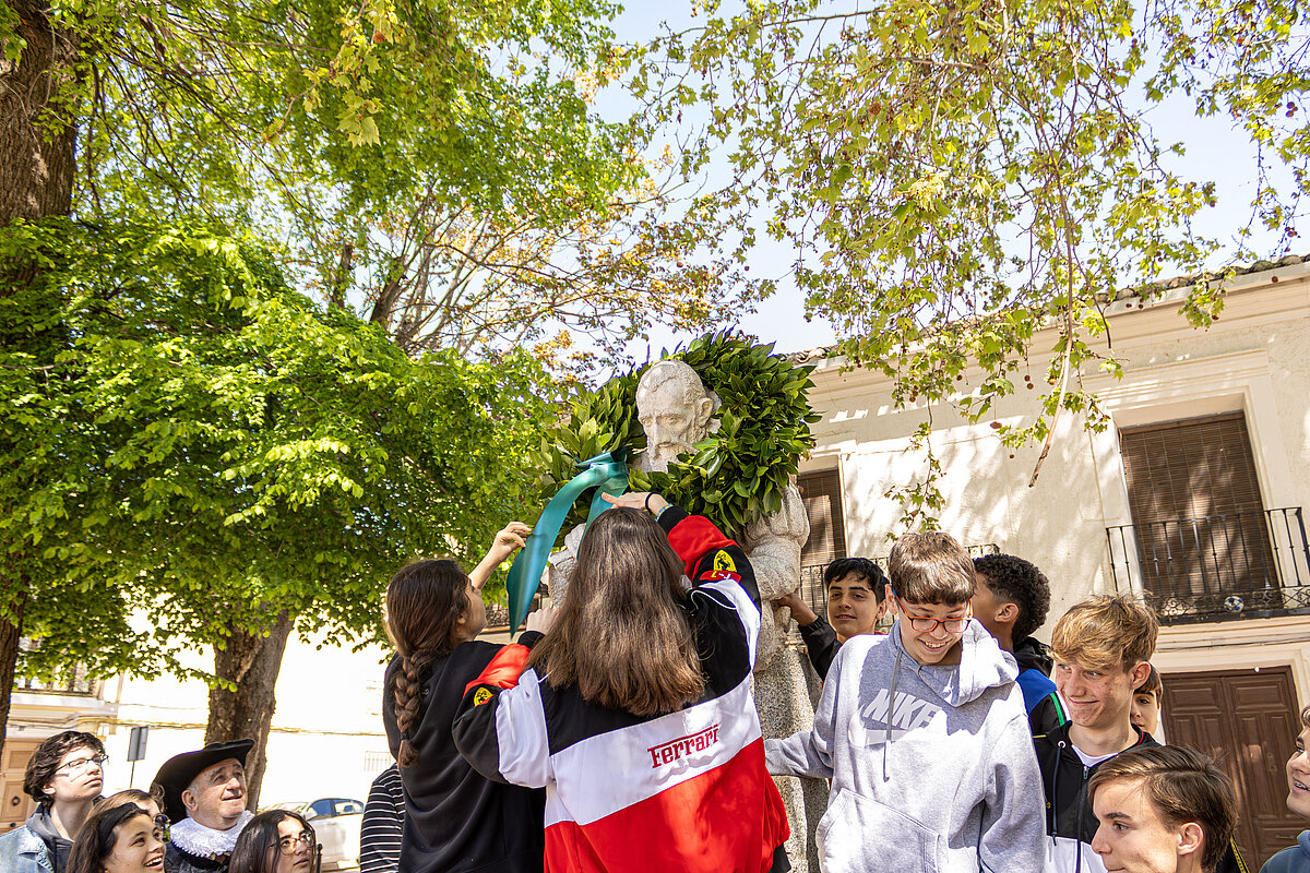Al término de la lectura, varios estudiantes depositaron una corona de laurel en la estatua de Miguel de Cervantes que preside la Plaza Alonso Quijano, una obra del escultor local Cayetano Hilario.