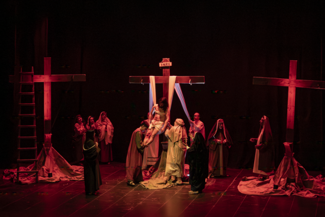 Durante cerca de dos horas de espectáculo, el elenco del Círculo Artístico San Lucas ofreció una intensa interpretación de los últimos momentos de la vida de Jesús de Nazaret, combinando interpretación teatral, música y cambios de escenografía que permitieron mantener el ritmo narrativo de la obra.