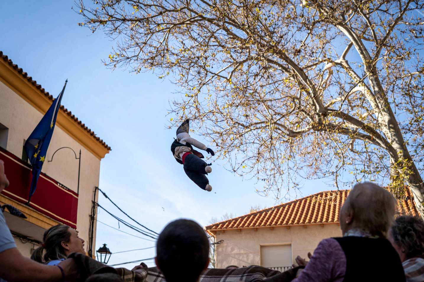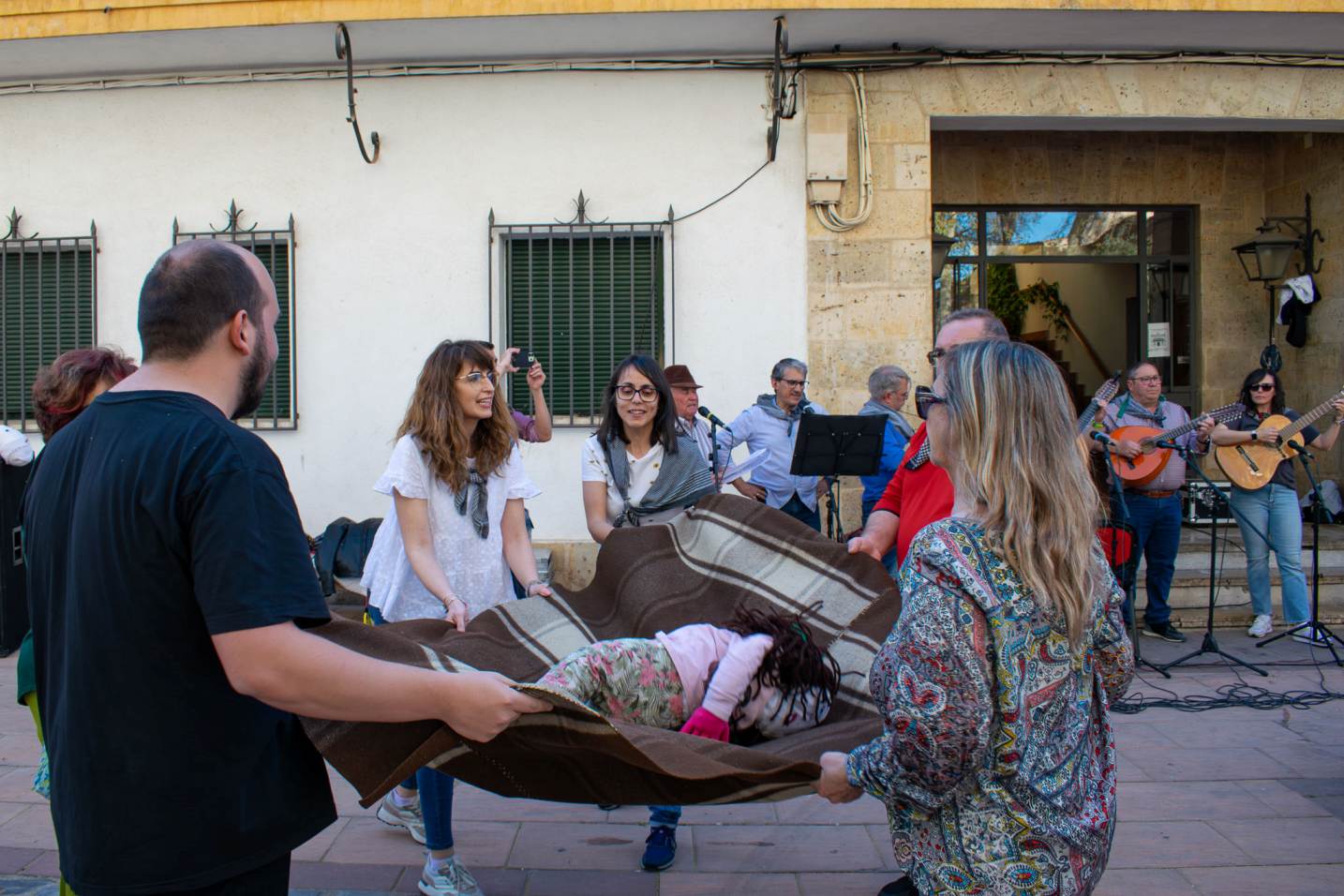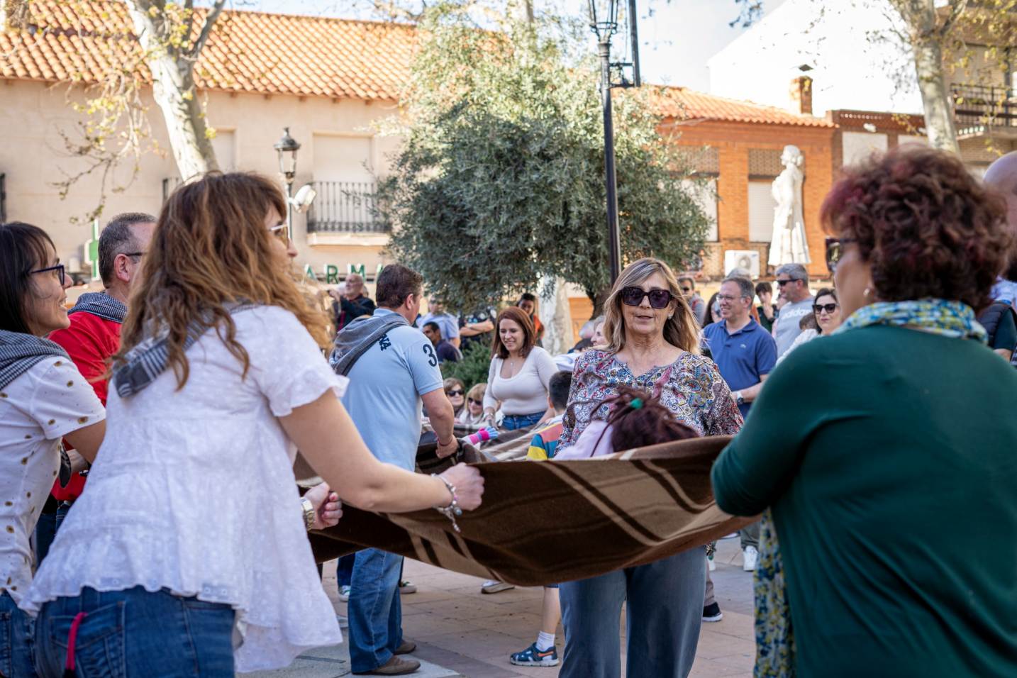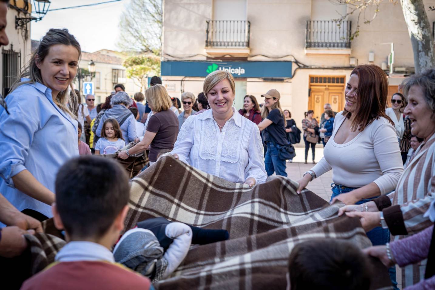 Durante la tarde, vecinos y vecinas participaron en el tradicional manteo del pelele, utilizando mantas centenarias elaboradas a mano en telar, piezas con gran valor etnográfico que antiguamente se empleaban para proteger a las mulas del frío.
