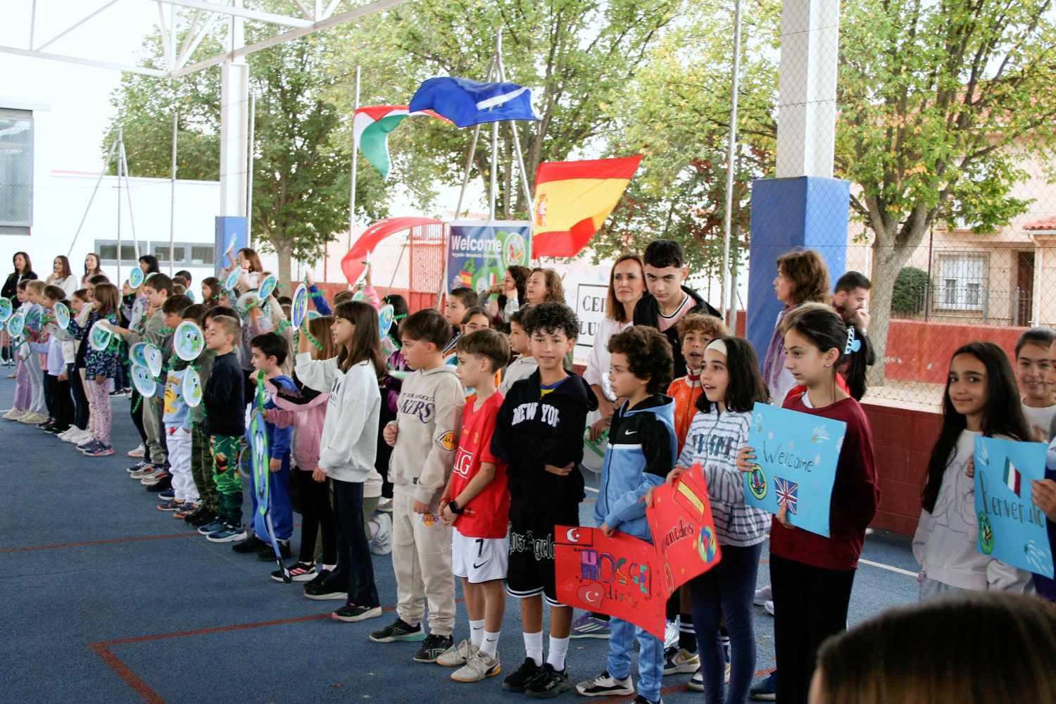 La mañana del lunes, 20 de octubre, arrancó en el CEIP “María Luisa Cañas” de Pedro Muñoz el quinto Proyecto Erasmus+ destinado al alumnado de entre 4 y 8 años y que tiene por nombre “Nature4kids”. Será el cuarto que este centro pedroteño coordine con el primer encuentro que tendrá lugar toda la semana y que se desarrollará entre el 20 y el 24 de octubre y el quinto en el que participa. Toda la comunidad educativa organizó un espectacular acto de recepción a los socios de Italia y Turquía, al que no faltó el alcalde de la localidad, Alberto Lara, que estuvo acompañado de los concejales de Educación y Cultura, David Díaz, Festejos, Empleo y Atención a la Ciudadanía, Alicia Alberca, y el de Agricultura y Urbanismo, Delfín Rosado, entre otros.