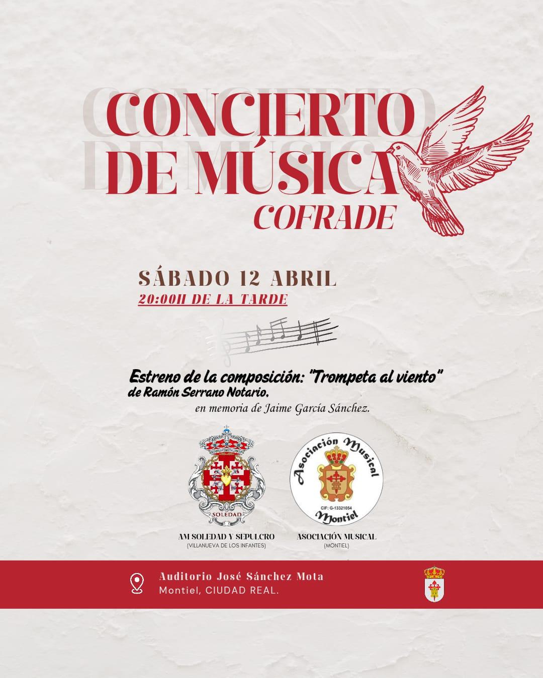 El sábado 12 de abril, habrá una Santa Misa a las 18:30h. Posteriormente, a las 20:00h, la AM Soledad y Sepulcro de Villanueva de los Infantes y la Asociación Musical de Montiel ofrecerán un concierto de música cofrade en el Auditorio José Sánchez Mota, en el que se estrenará la composición “Trompeta al viento” de Ramón Serrano Notario, en memoria de Jaime García Sánchez.