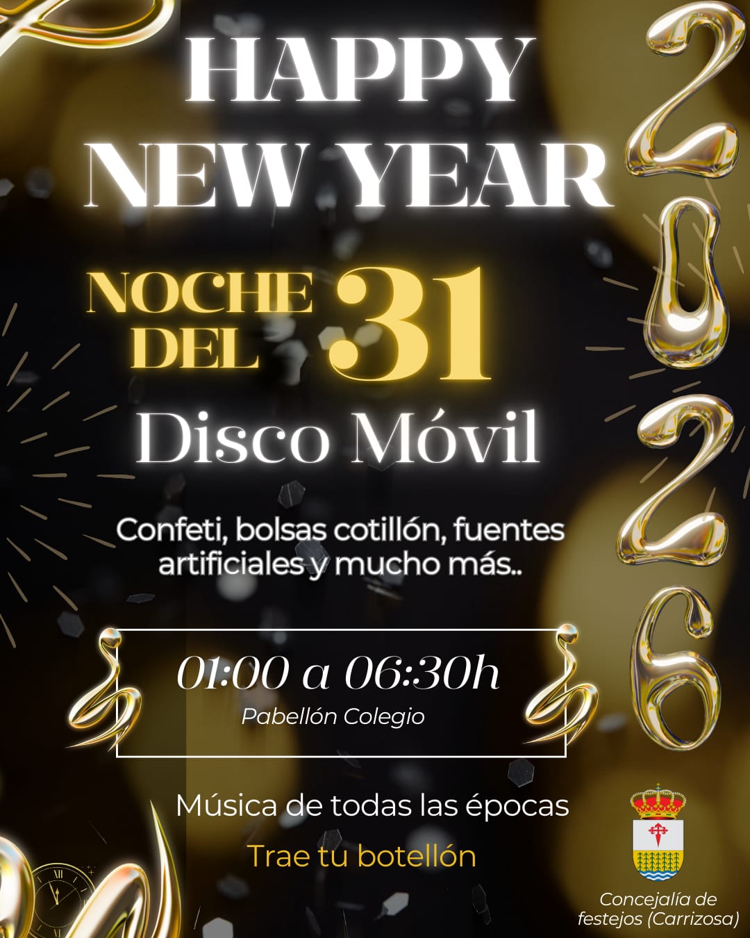 Y este mismo día, por la noche, Cotillón y Disco Móvil en el pabellón del Colegio, de la 1 a las 6.30 horas de la madrugada, para despedir el año con buen rollito, y confeti, bolsas de cotillón, fuentes artificiales y mucho más. Se permitirá entrar con bebidas.