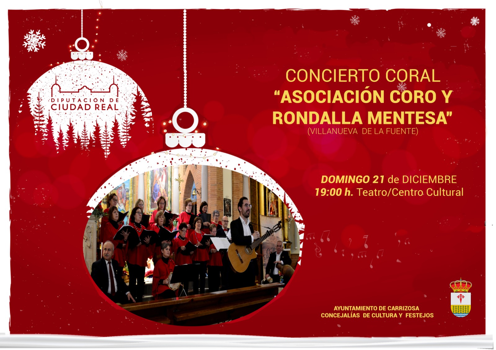 Los actos siguen el próximo domingo 21 de diciembre a las 19 horas, en el Teatro Municipal, con el Concierto Coral de Villancicos, a cargo de la Asociación Coro y Rondalla Mentesa, de Villanueva de la Fuente.