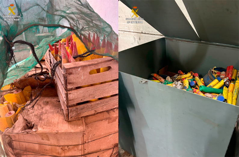 Una vez en el lugar del hallazgo, comprobaron la existencia de un palé con varias cajas de madera y cartón conteniendo un total de 67 cohetes antigranizo marca CETME, modelo COTA 3000 de una empresa pirotécnica ubicada en el pasado en Barcelona.