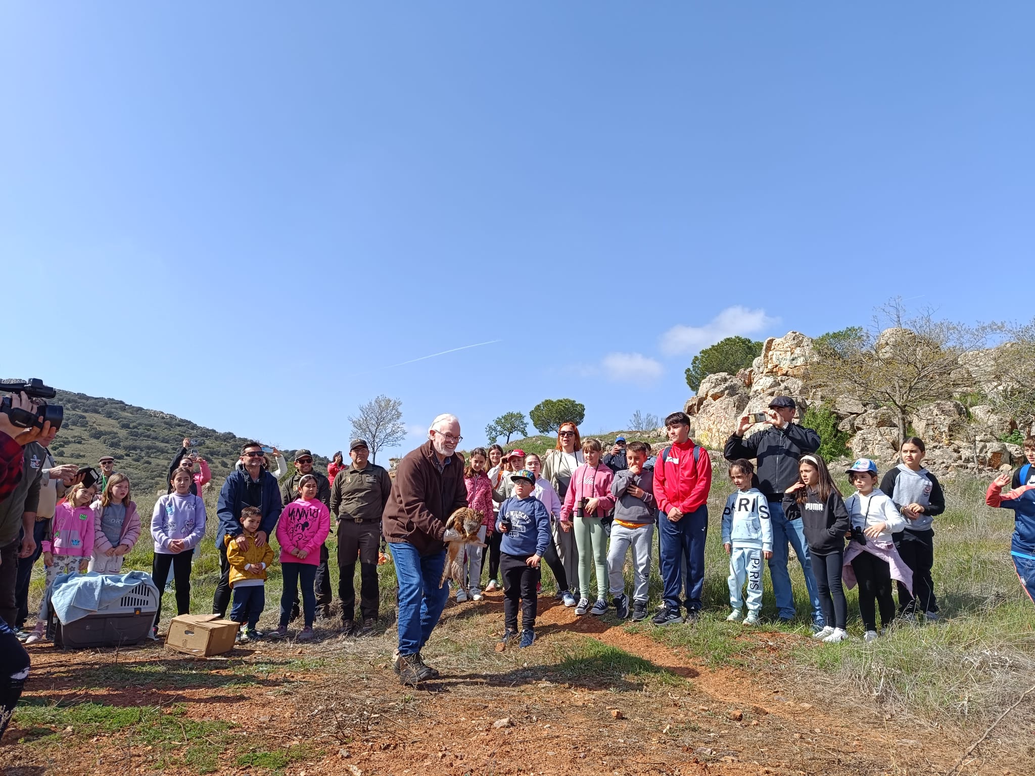 Durante el acto de suelta que ha contado con la asistencia de setenta alumnos y alumnas del CEIP ‘San Juan Bosco’ de San Carlos del Valle, el delegado provincial de Desarrollo Sostenible en Ciudad Real, Casto Sánchez, ha ratificado el compromiso del Gobierno de Castilla-La Mancha con el trabajo que realizan los profesionales del centro de recuperación de fauna salvaje ‘El Chaparrillo’ “para proteger y preservar las especies de aves rapaces que llegan al centro con alguna enfermedad o lesión que les impide seguir viviendo en libertad y a quienes cuidan y sanan de sus heridas con el objetivo prioritario de devolverles a la naturaleza”.