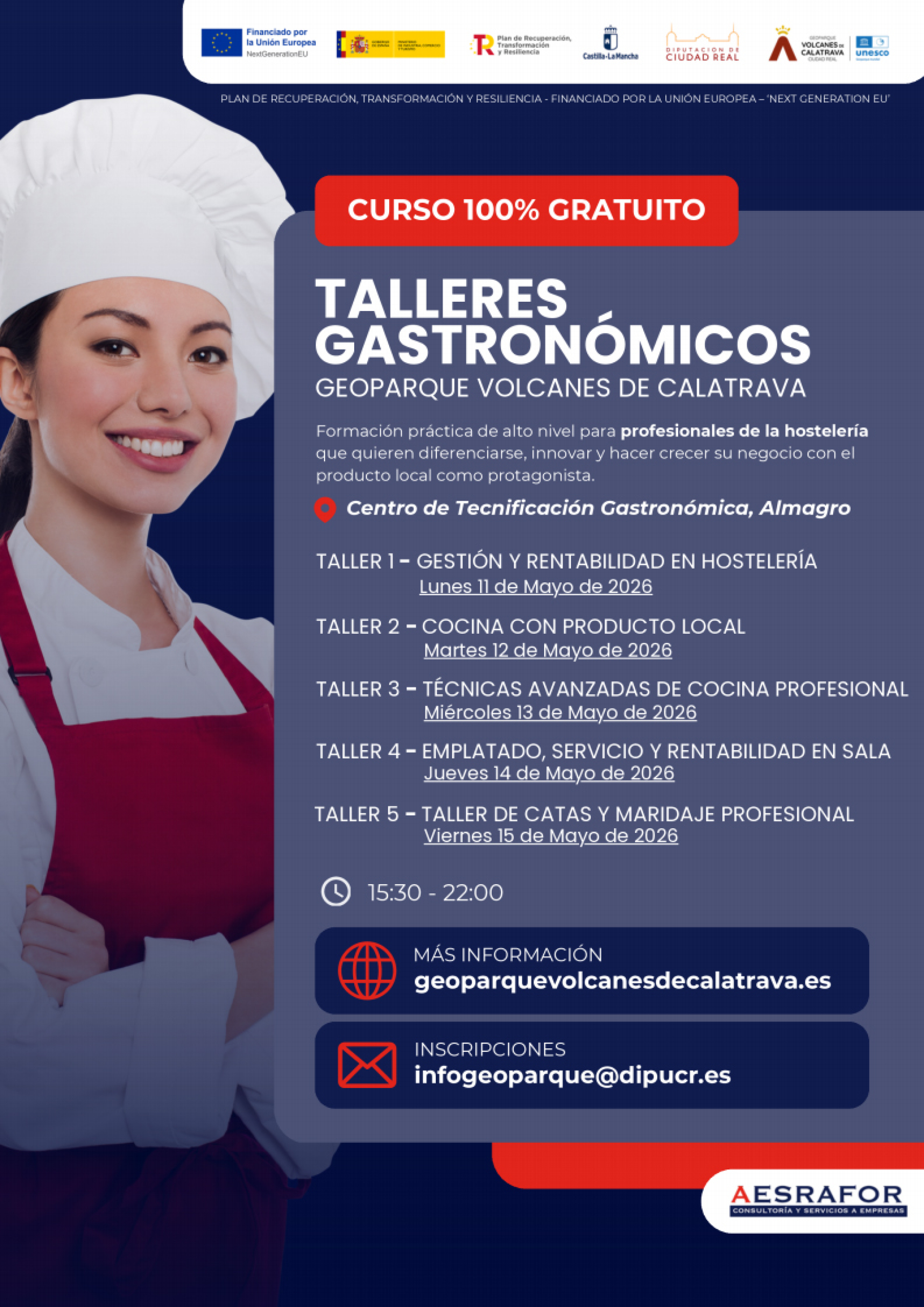 Ya se puede solicitar plaza a través del formulario de inscripción que se encuentra en la página web del Geoparque Volcanes de Calatrava https://geoparquevolcanesdecalatrava.es/inscripcion-talleres-gastronomicos-geoparque-volcanes-de-calatrava/ y su remisión al correo electrónico document.getElementById(‘cloakeb515b2446e786413a55c3b057b7af5f’).innerHTML = »; var prefix = ‘ma’ + ‘il’ + ‘to’; var path = ‘hr’ + ‘ef’ + ‘=’; var addyeb515b2446e786413a55c3b057b7af5f = ‘infogeoparque’ + ‘@’; addyeb515b2446e786413a55c3b057b7af5f = addyeb515b2446e786413a55c3b057b7af5f + ‘dipucr’ + ‘.’ + ‘es’; var addy_texteb515b2446e786413a55c3b057b7af5f = ‘infogeoparque’ + ‘@’ + ‘dipucr’ + ‘.’ + ‘es’;document.getElementById(‘cloakeb515b2446e786413a55c3b057b7af5f’).innerHTML += ‘<a ‘ + path + »’ + prefix + ‘:’ + addyeb515b2446e786413a55c3b057b7af5f + »>’+addy_texteb515b2446e786413a55c3b057b7af5f+'</a>’; . El plazo de inscripción estará abierto hasta el día 6 de mayo de 2026.
