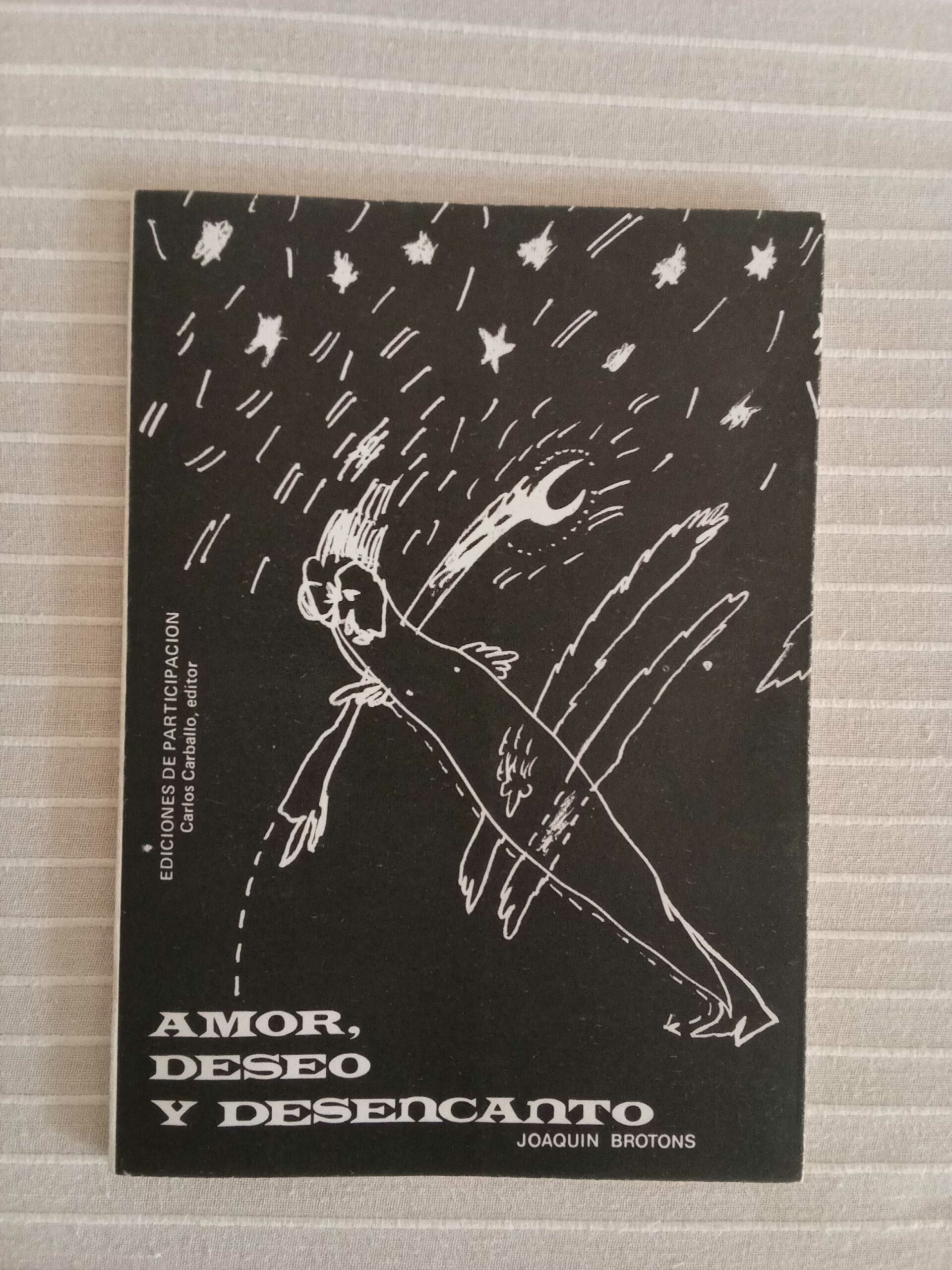 “Amor, deseo y desencanto” es el tercer poemario de Joaquín Brotons Peñasco (Valdepeñas, 1952). Publicado por Ediciones de Participación en 1979, esta obra se compone de veinticuatro poemas en los que el autor evoca el tránsito desde el territorio fértil del amor, la noche, el estío, la piel y los abrazos hasta los baldíos solares de la melancolía, hasta esa tristeza que Luis Cernuda (Sevilla, 1902 – Ciudad de México, 1963) versificó con ánimo desolado: “Como un golpe de viento / que deshace la sombra, / caí en lo negro / en el mundo insaciable / He sido”. Ya desde el principio, Joaquín humaniza la luna llena y la designa como centinela de emociones, también como estricta vigía de la cadencia del corazón: “La luna está viva, callada, silenciosa en su noche…”, “La luna es el espejo doble de la vida, / de los sueños…”. Porque la luna es el poder que combate las sombras y alumbra al Poeta en su proceso creativo. La luna es inspiración, luz de ceniza en el túnel de los sueños. En este tránsito accidentado emergen, de súbito, paranoias de muerte, cantos fúnebres y desesperación: “Y siento en mi boca… / un fuego estrellado en el espacio de un amor / incandescente…”, sentimientos macerados en la tiniebla y sólo conjurados por los deseos y el sueño de un amor que navega, vuela y se arrastra entre el oleaje de la libertad.