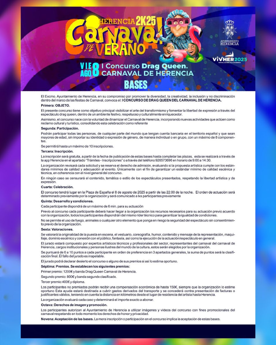 El Ayuntamiento de Herencia pone en marcha el I Concurso de Drag Queen, con el objetivo de seguir visibilizando y apostando por una cultura y el arte en todos sus primas y perspectivas además de hacer más grande aún su carnaval.