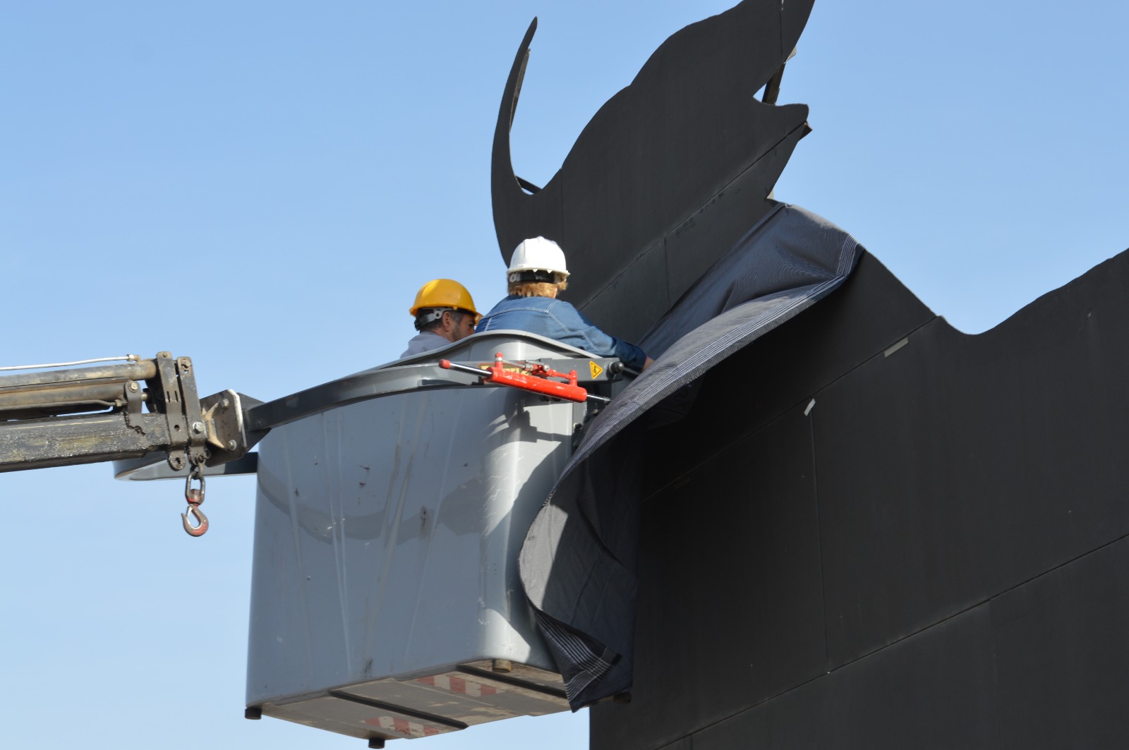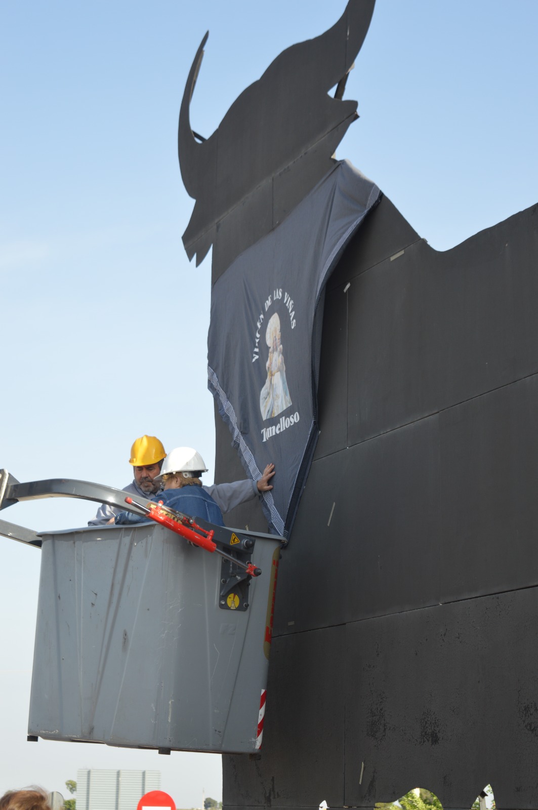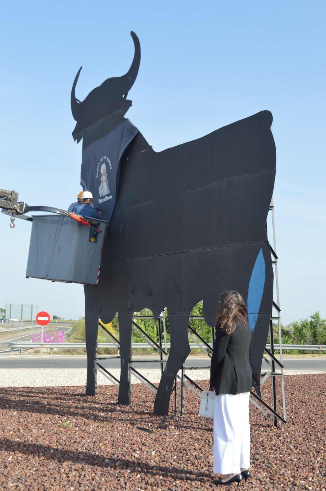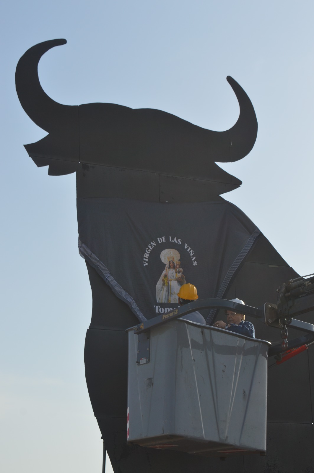 La colocación del pañuelo enlaza dos símbolos muy reconocibles: por un lado, el Toro de Osborne, figura destacada del paisaje; por otro, el pañuelo tradicional, ligado a la fiesta, al campo, a la romería y a las raíces manchegas.