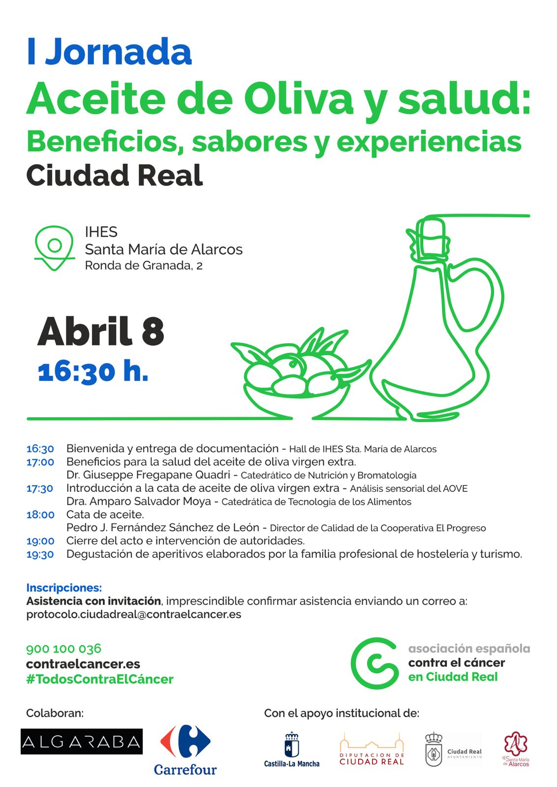 La Asociación Española contra el Cáncer en Ciudad Real organiza la 1ª Jornada “Aceite de oliva y salud: beneficios, sabores y experiencias”, que tendrá lugar el próximo 8 de abril a las 16.30 horas en el Instituto de Secundaria Santa María de Alarcos de Ciudad Real.