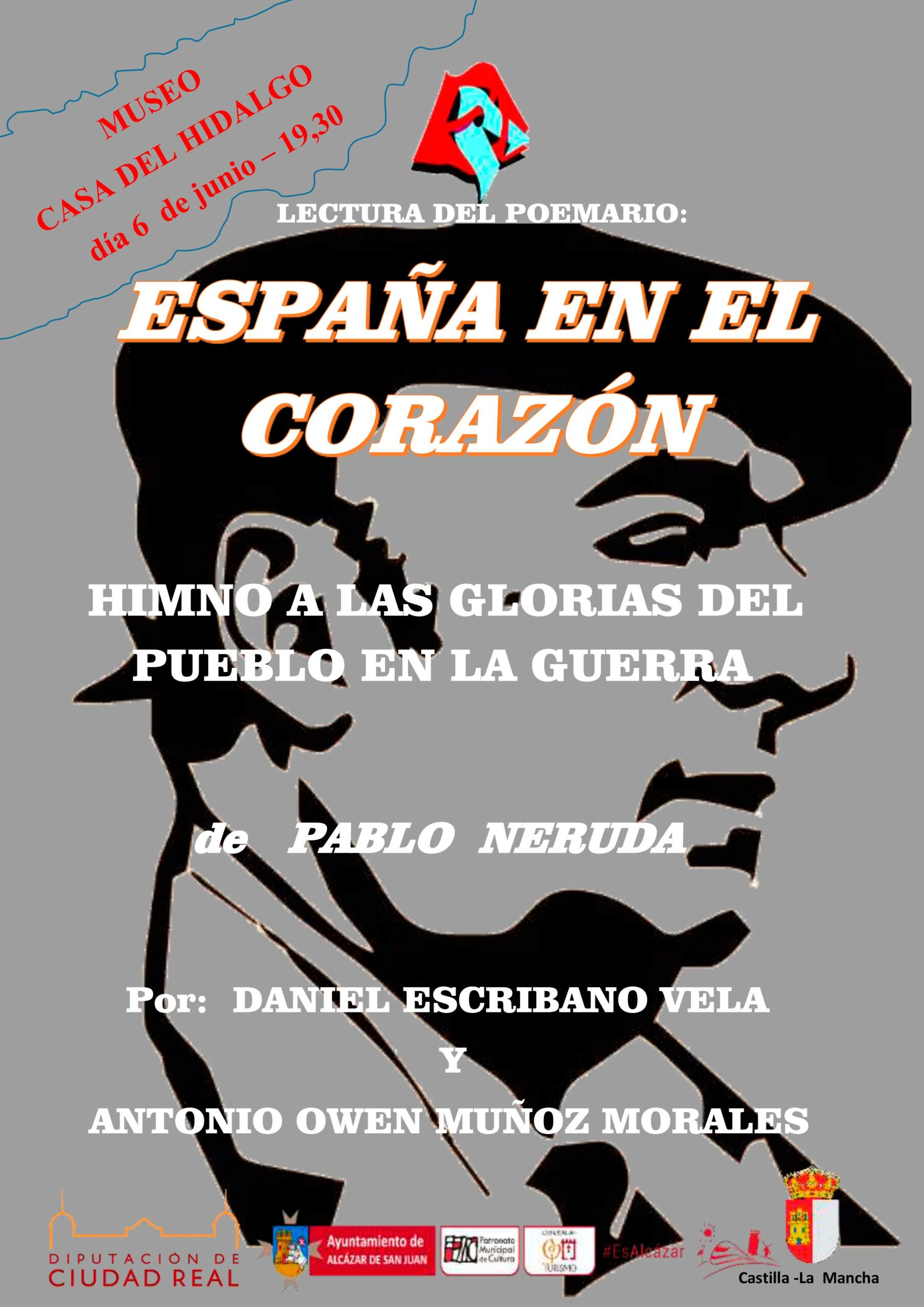 El viernes, día 06 de Junio, en la Casa del Hidalgo de Alcázar de San Juan, sita en la calle Cautivo, núm. 23, tendrá lugar el Recital-lectura “España en el Corazón”, de Pablo Neruda a cargo de los poetas del Ateneo Daniel Escribano Vela y Antonio Owen Muñoz Morales.