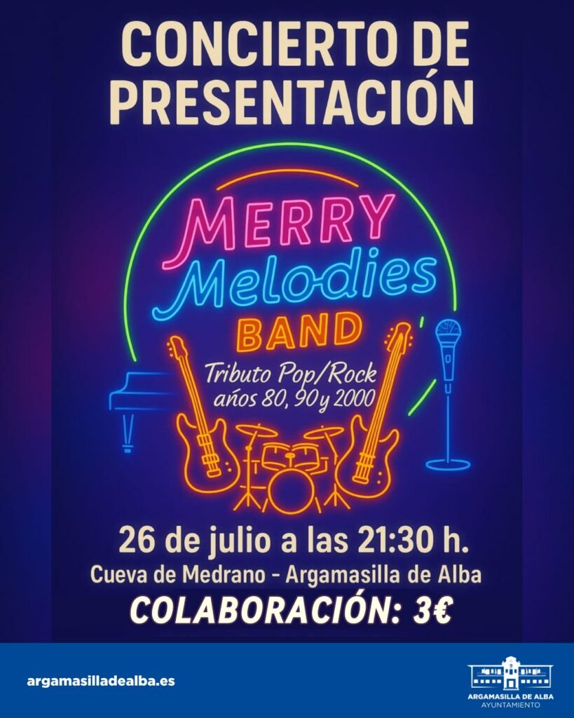 El próximo 26 de julio a las 21:30 h, la música en directo llenará la Cueva de Medrano con el concierto de presentación de Merry Melodies Band, un nuevo grupo que rinde tributo al mejor Pop y Rock de los años 80, 90 y 2000. Una cita para disfrutar de grandes temas y buen ambiente.
