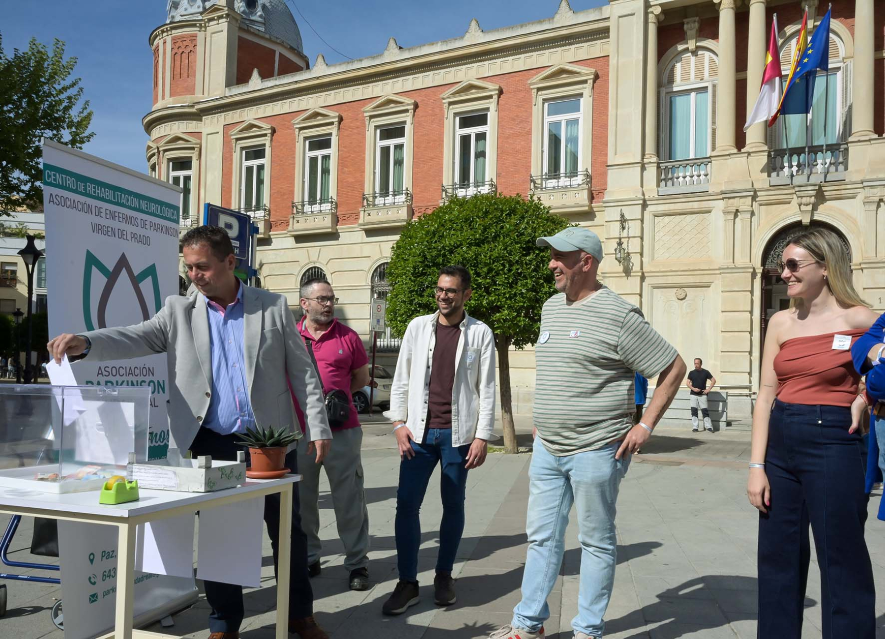 Carlos Jesús Villajos, en representación de la Diputación de Ciudad Real, se ha acercado esta mañana hasta la mesa de cuestación que la Asociación de Enfermos de Parkinson “Virgen del Prado” ha instalado frente al Palacio Provincial, donde ha hecho entrega de una aportación económica y se ha interesado por los avances que permiten mejorar la calidad de vida de los pacientes con esta enfermedad. Asimismo, ha mostrado el apoyo de la institución provincial a la asociación, en el marco de las actividades que se están llevando a cabo con motivo del Día Mundial de la enfermedad, que se conmemora cada 11 de abril coincidiendo con el aniversario del nacimiento de James Parkinson.