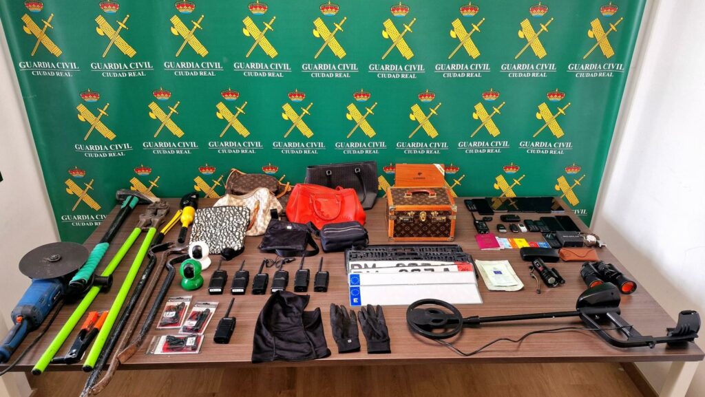 Numerosos teléfonos móviles, pasamontañas, cizalla hidráulica para corte de rejas, walkies con auriculares, inhibidores, infrarrojos, cámaras, linternas, routers portátiles, placas de matrículas de diversos vehículos, portamatrículas, diversa documentación falsa, etc.