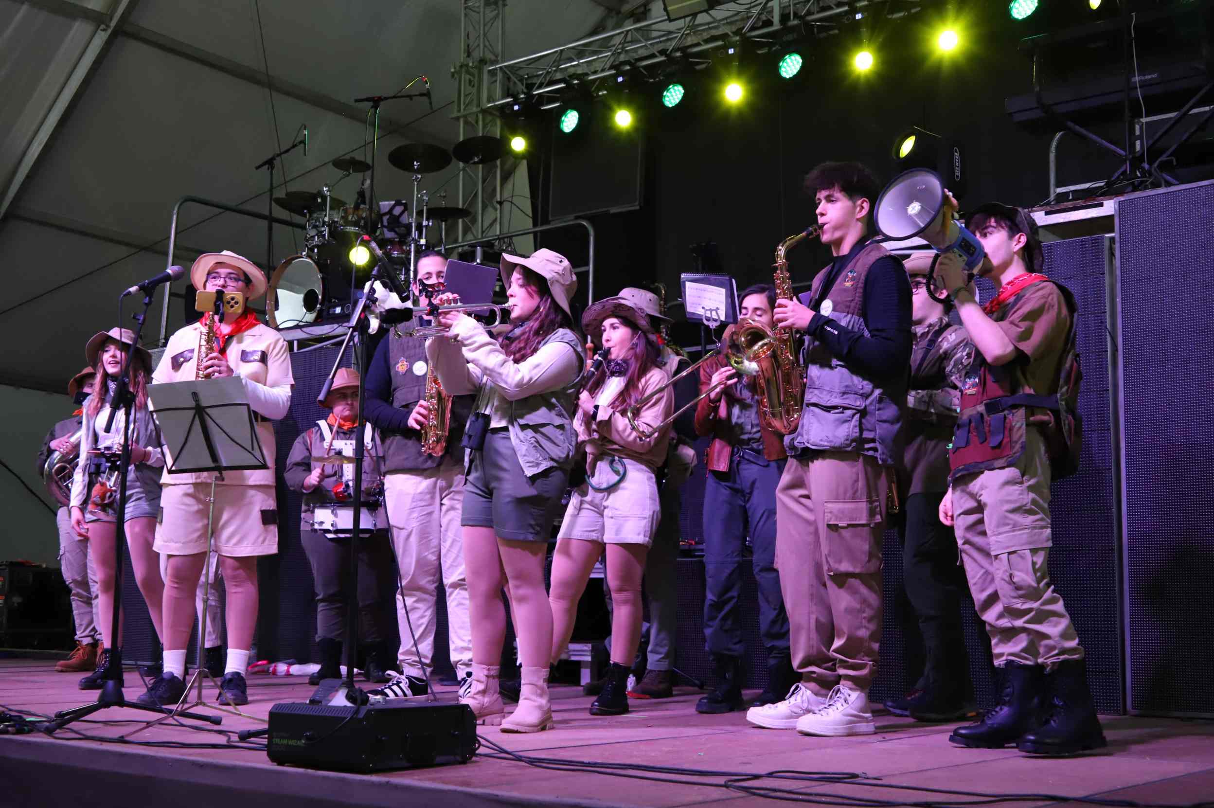 Los catorce miembros de la Charanga Vinoblanco se convirtieron en exploradores llegados a Manzanares desde un lugar lejano y absorbidos por un juego de mesa, ‘Manzanji’, nombre que dio título al espectáculo con el que deleitaron al público asistente. “Este pregón nos ha hecho salir de nuestra zona de confort”, confesó Álvaro Molina, “así que además de tocar nuestras canciones nos hemos atrevido también a interpretar unos pequeños teatrillos”.