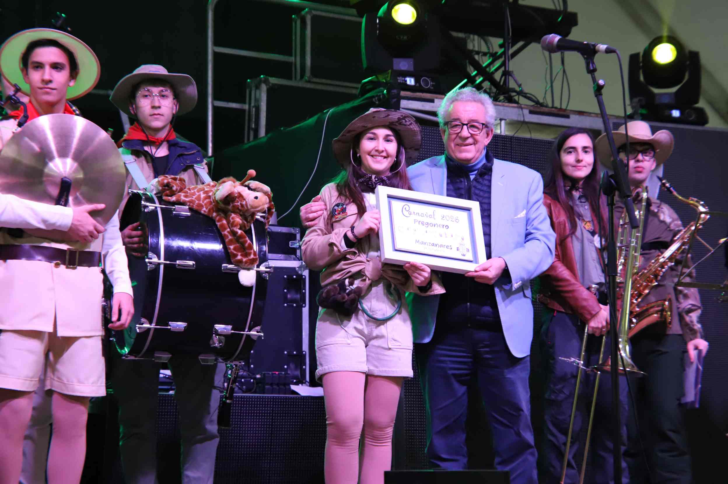 El inicio oficial del carnaval 2026 en Manzanares tuvo lugar el pasado viernes en la carpa instalada en el auditorio municipal ‘La Pérgola’. La responsabilidad de protagonizar el pregón este año recayó en la Charanga Vinoblanco, que añadió pequeñas actuaciones teatrales a su habitual repertorio musical en un espectáculo titulado ‘Manzanji’.