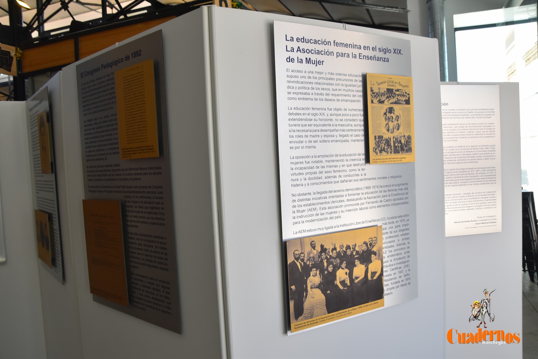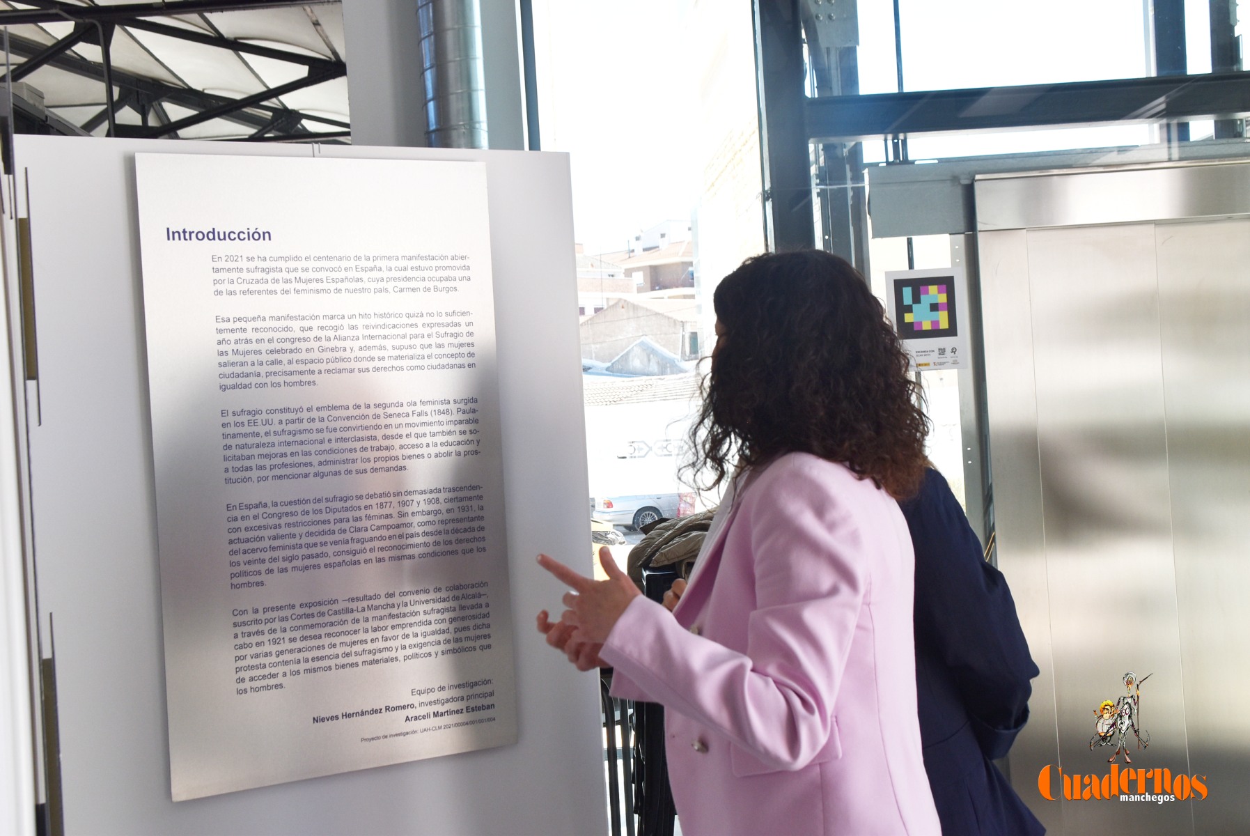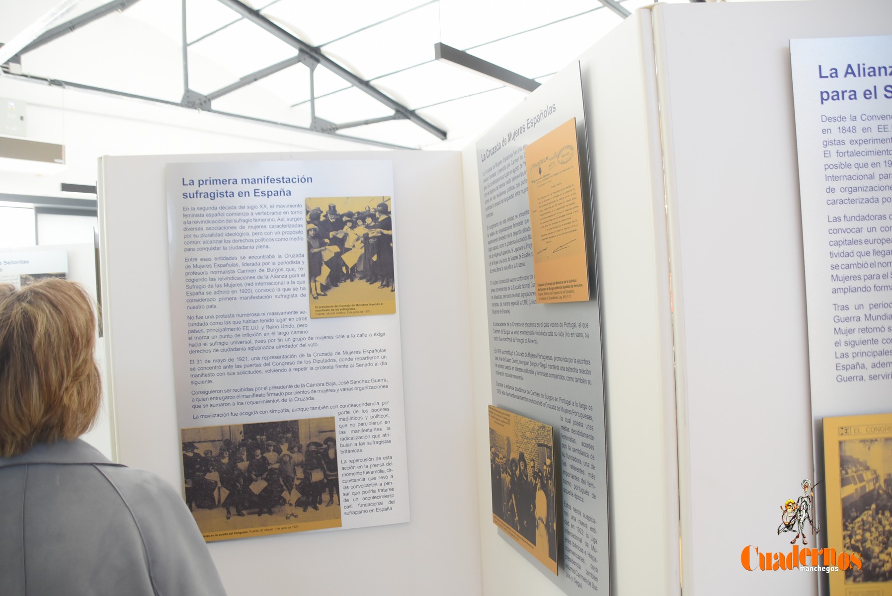 La exposición consta de 16 paneles donde se aprecian fotografías históricas de las movilizaciones sufragistas e imágenes de mujeres relevantes y activistas, pioneras del movimiento feminista en España y se había conseguido por los estudios de investigación realizadas por dos mujeres: Araceli Martínez y Nieves Hernández en el estudio de la primera manifestación realizada en Madrid el 21 de mayo de 1921, donde las mujeres salieron a reivindicar igualdad de derechos con los hombres, que se consiguieron materializar en el año 1933 con las votaciones elecciones municipales en abril y, posteriormente a las elecciones generales en noviembre, agradeciendo la celebración del 90 aniversario en Castilla-La Mancha que suponía “poder proporcionar los sucesos de importancia y poder seguir contestando derechos y no perderlos y estar alerta igualmente para las manifestaciones negacionistas y poner pared para no dar marcha atrás”.