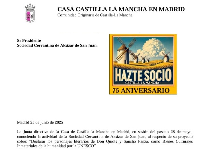 Con una gran satisfacción han despedido el mes de junio desde la junta directiva de la Sociedad Cervantina de Alcázar de San Juan, pues las adhesiones a la declaración del legado de don Quijote y Sancho Panza en las letras, las artes y las ciencias, como Patrimonio Cultural de la Humanidad, se siguen produciendo de forma ininterrumpida y desde diferentes estamentos y países del mundo.