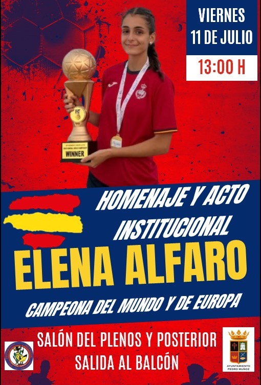 Este viernes 11 de julio a las 13:00h, el Ayuntamiento de Pedro Muñoz ha preparado con todo cariño un acto de homenaje muy especial en su salón de Plenos, donde se rendirá un homenaje a la joven Elena Alfaro, jugadora del Kiriko Deportivo Retamar, por sus impresionantes logros deportivos a nivel internacional con la selección española juvenil femenina en BM playa.