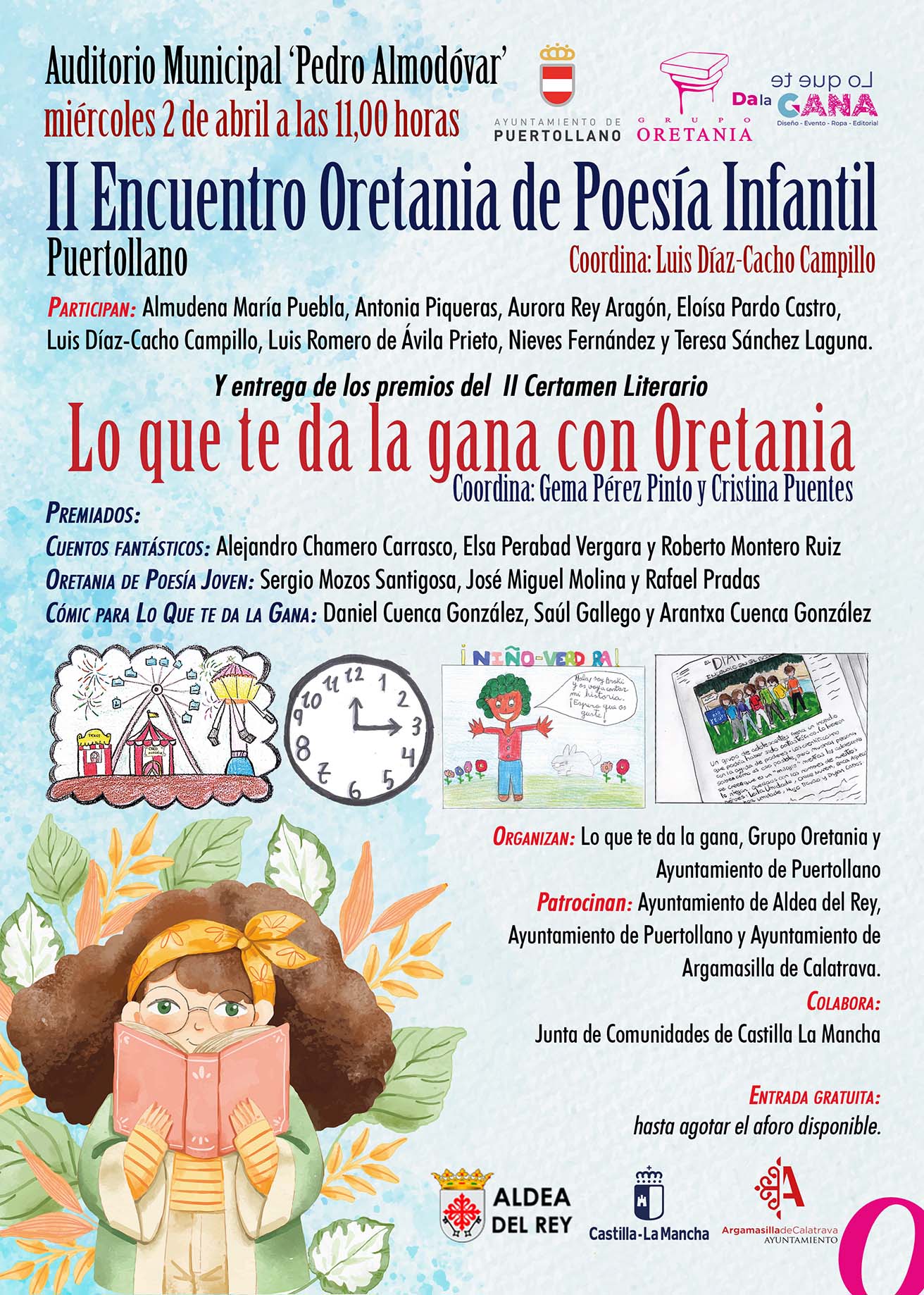 Entre los medios utilizados por este grupo cultural, se encuentra la creación de la colección “Poemas para Marina”, que se complementa con la colección “Cuentos para Alba”. Junto a ‘Lo que te da la gana’, la puesta en marcha del citado certamen literario infantil, que contempla tres concursos: ‘Cuentos fantásticos’, ‘Cómic para Lo Que te da la Gana’ y ‘Oretania de Poesía Joven’. Además de este ‘II Encuentro Oretania de Poesía Infantil’, que tendrá lugar en Puertollano, el 2 de abril, a las 11:00 horas, en el Auditorio Municipal “Pedro Almodóvar”, durante la entrega de los premios de los concursos citados anteriormente. Con entrada libre hasta completar el aforo.