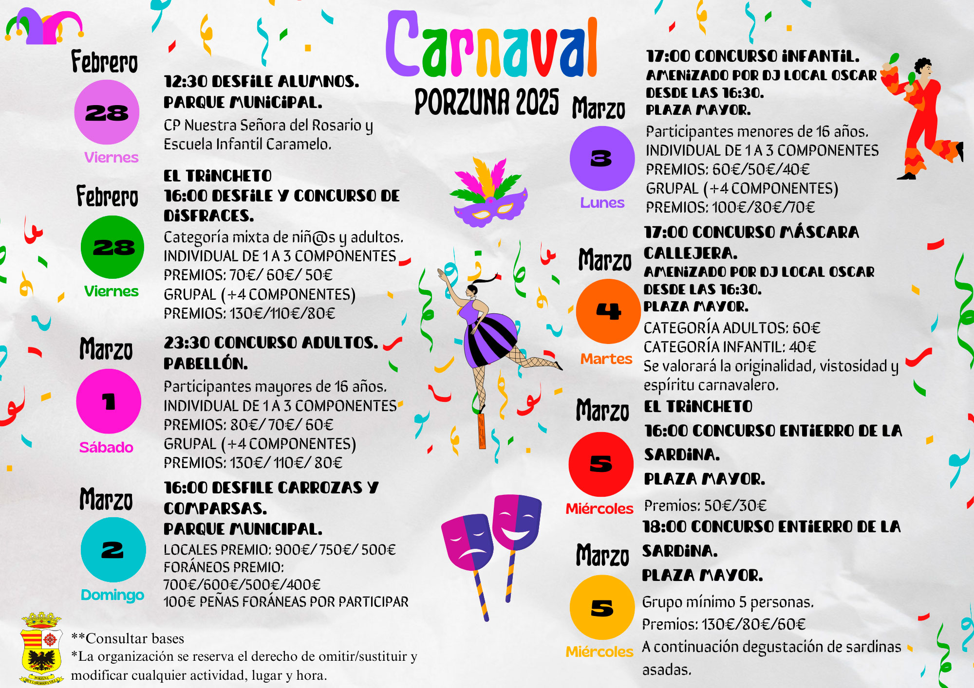 El Ayuntamiento de Porzuna ha preparado una programación muy completa para celebrar en el municipio el Carnaval. Las actividades comienzan este viernes 28 de febrero y se prolongan hasta el próximo 5 de marzo.