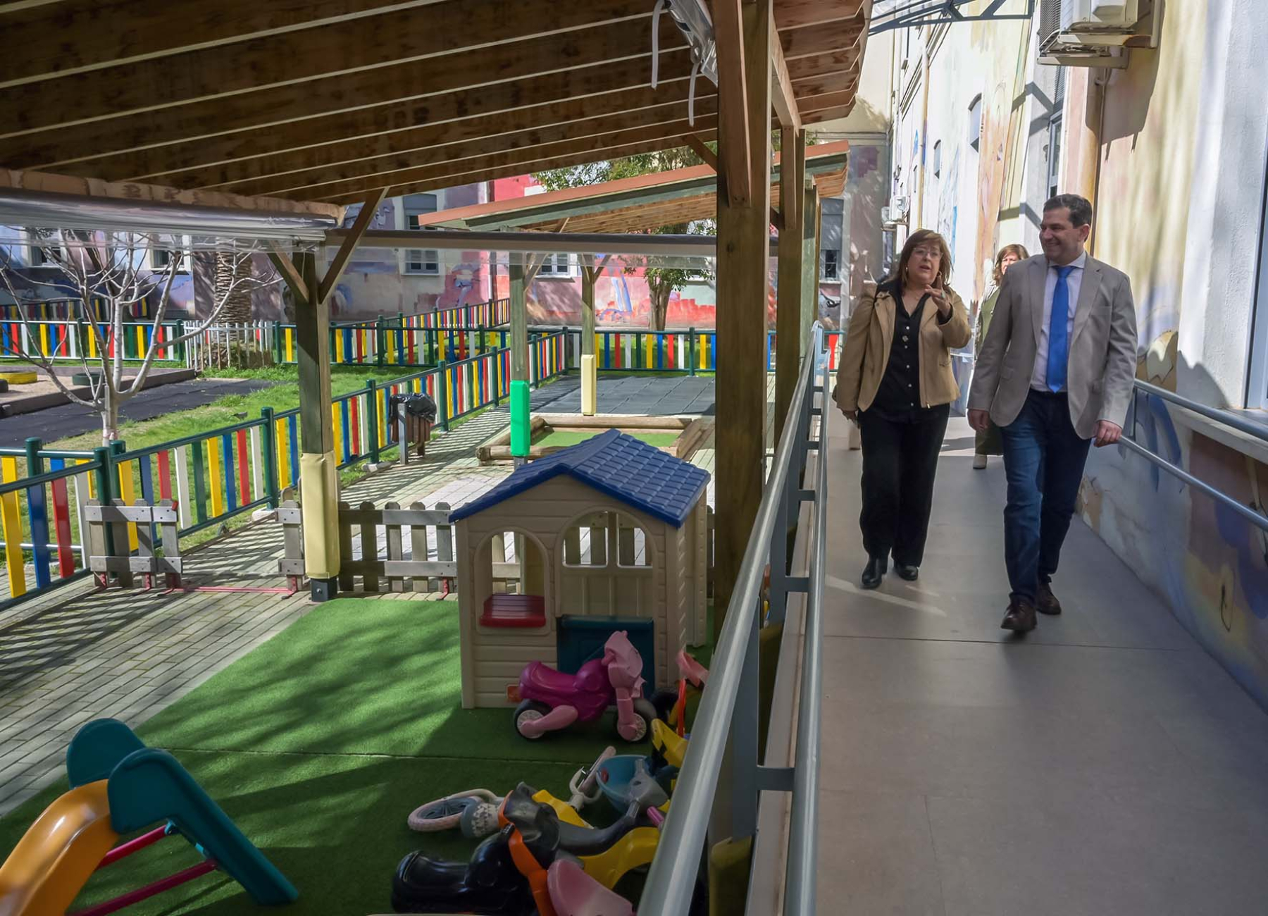 Entre las actuaciones realizadas en el último año ha detallado la instalación de nuevas puertas de seguridad en pasillos y accesos a las aulas, diseñadas con un sistema especial antipinzamiento con pivote único que evita que los niños puedan pillarse los dedos. Asimismo, se han renovado completamente las vallas del patio de recreo, se ha instalado una pérgola y se ha construido una rampa de acceso en la zona de bebés para mejorar la accesibilidad.