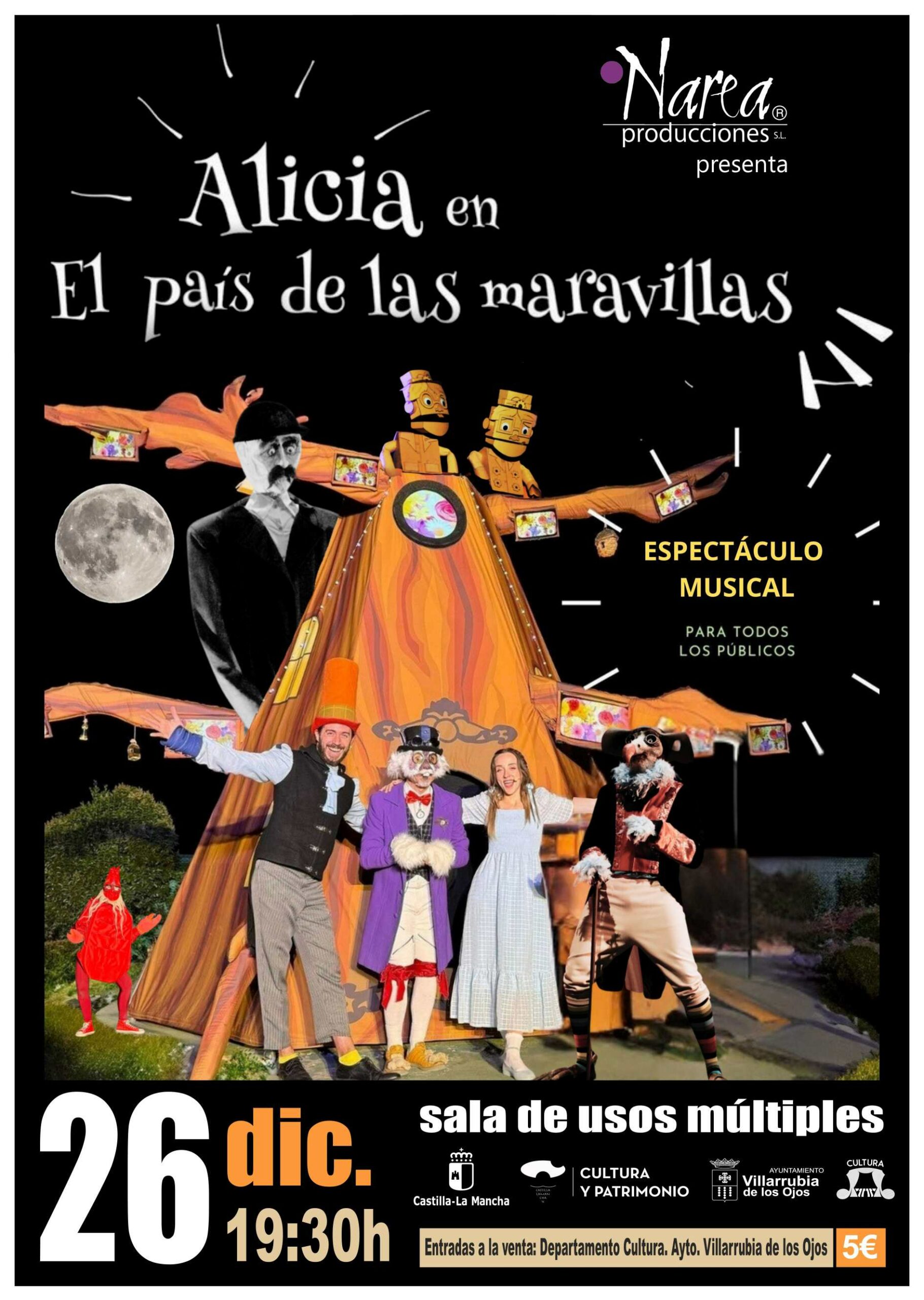 La compañía Narea Producciones representará el 26 de diciembre este espectáculo Teatral y Musical, que se encuadrada dentro de la programación de artes escénicas y música que cofinancia la Junta de Comunidades de Castilla-La Mancha y el Ayuntamiento de Villarrubia de los Ojos a través de su concejalía de Cultura. Este musical es más que un entretenimiento; es un punto de encuentro cultural que enriquece, fomenta la creatividad y celebra la herencia de unos sueños, al igual que el País de las Maravillas, está llena de encanto, historia y personajes inolvidables. Las entradas pueden adquirirse al precio de 5 euros en el Departamento de Cultura del Ayuntamiento de Villarrubia de los Ojos.