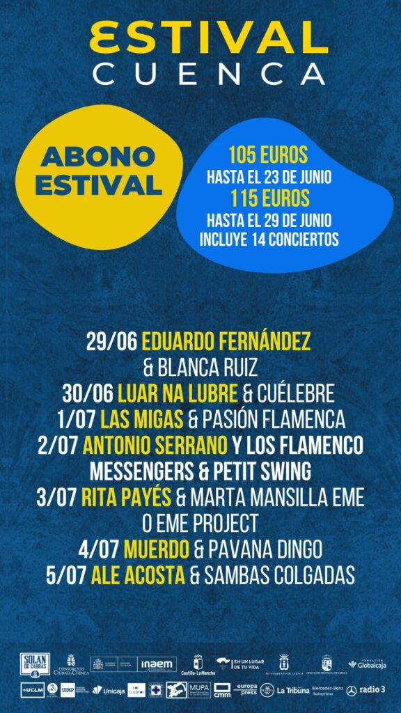 ABONOS. Ya están a disposición de todos los interesados los abonos para catorce conciertos y siete días de la 14ª edición de Estival Cuenca. Estos recitales tendrán lugar entre el domingo 29 de junio y el sábado 5 de julio. El precio de este abono es de 15 euros hasta el 23 de junio. Así, cada concierto tiene un coste de tan solo 7,5 euros. Después, hasta el 28 de junio su precio se situará en 115 euros, 8,21 euros cada recital. Cabe destacar el hecho de que bajan 15 y 25 euros respectivamente e incluyen un recital más en comparación a 2024 .