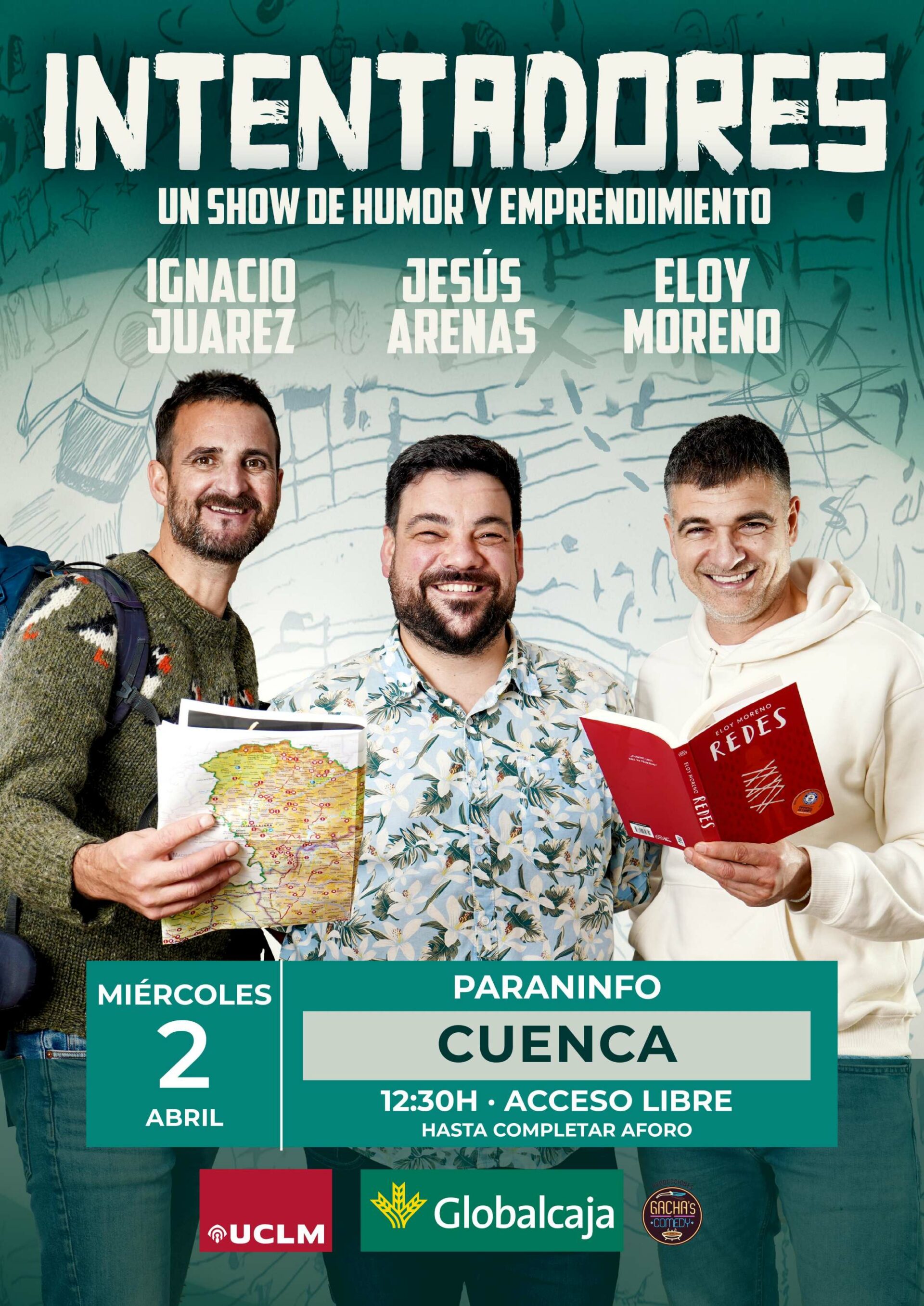 En primer lugar, el Paraninfo de la UCLM en Cuenca acoge el miércoles 2 de abril (12:30 h., acceso libre) el encuentro «Intentadores». Se trata de un espectáculo de humor y emprendimiento protagonizado por el escritor Eloy Moreno, el humorista manchego Jesús Arenas y el aventurero navarro Ignacio Juárez. Con un formato fresco y cercano, los tres compartirán anécdotas, secretos y experiencias personales que les llevaron a cambiar sus vidas. Este evento llega al campus de Cuenca de la UCLM gracias al apoyo de Globalcaja.