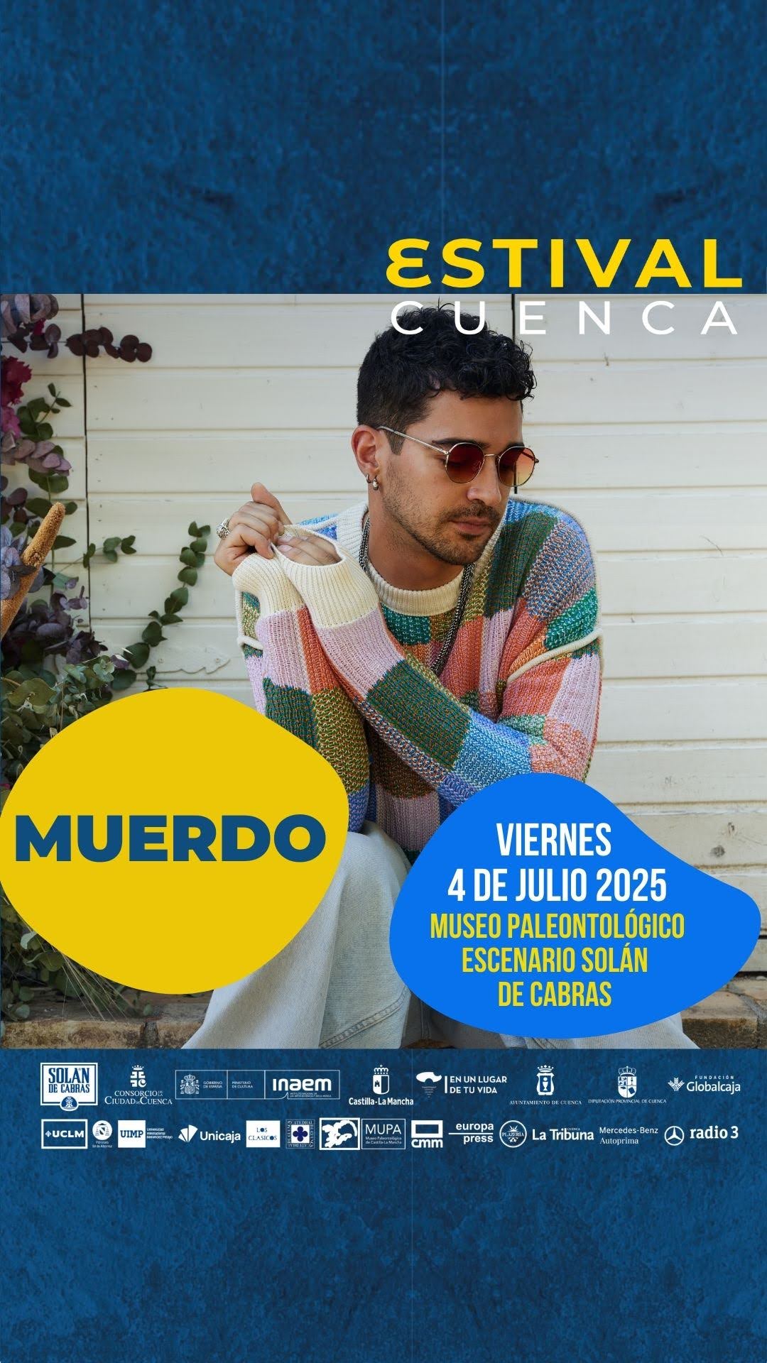 Muerdo, alter ego de Pascual Cantero (Molina de Segura, Murcia, 1988), se une al cartel de Estival Cuenca 25 en el apartado dedicado al mestizaje y a la canción de autor. Más en concreto, el cantante y compositor actuará el viernes 4 de julio en el Escenario Solán de Cabras del Museo Paleontológico de Castilla-La Mancha. Junto con su banda, ofrecerá un directo para disfrutar con los cinco sentidos.