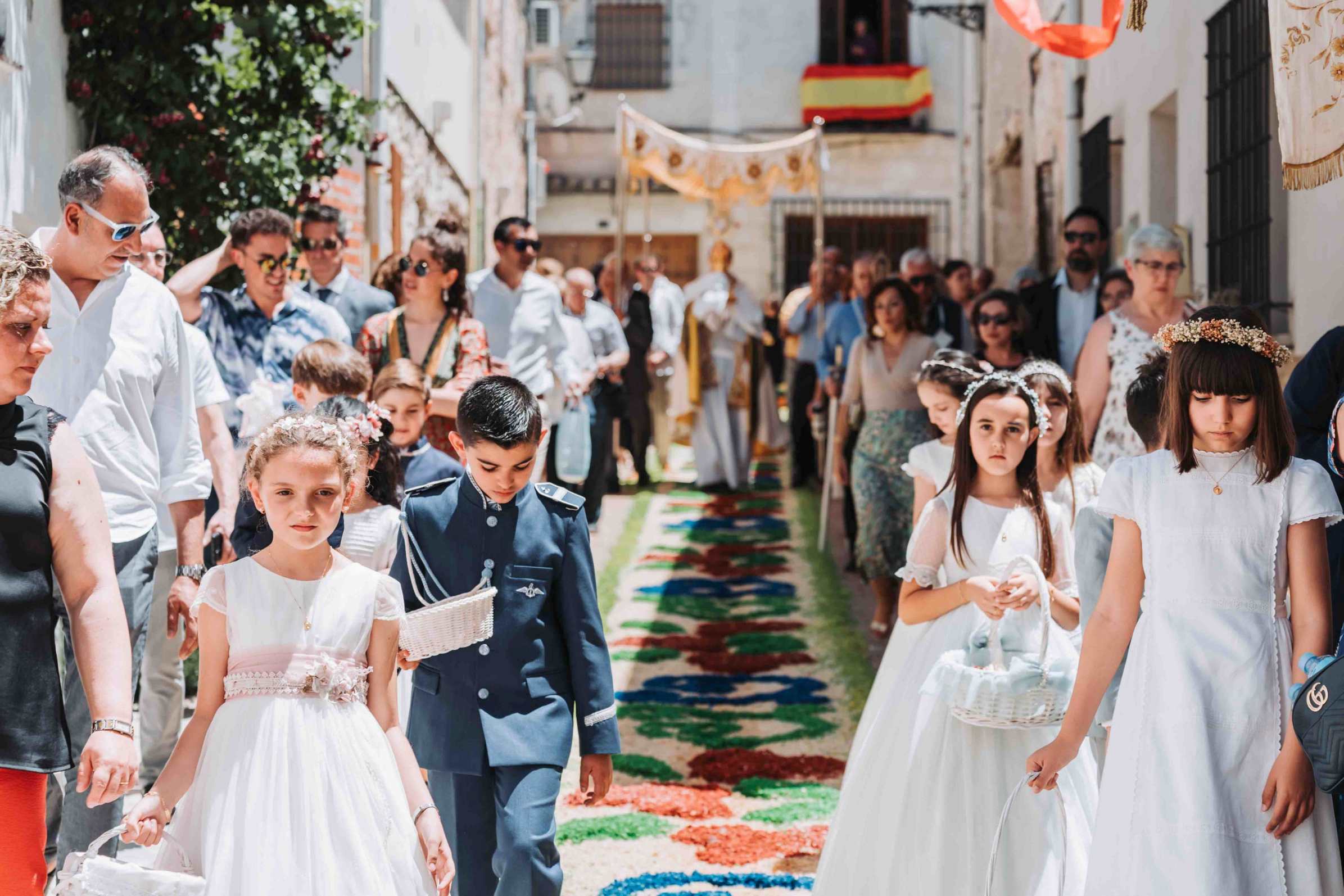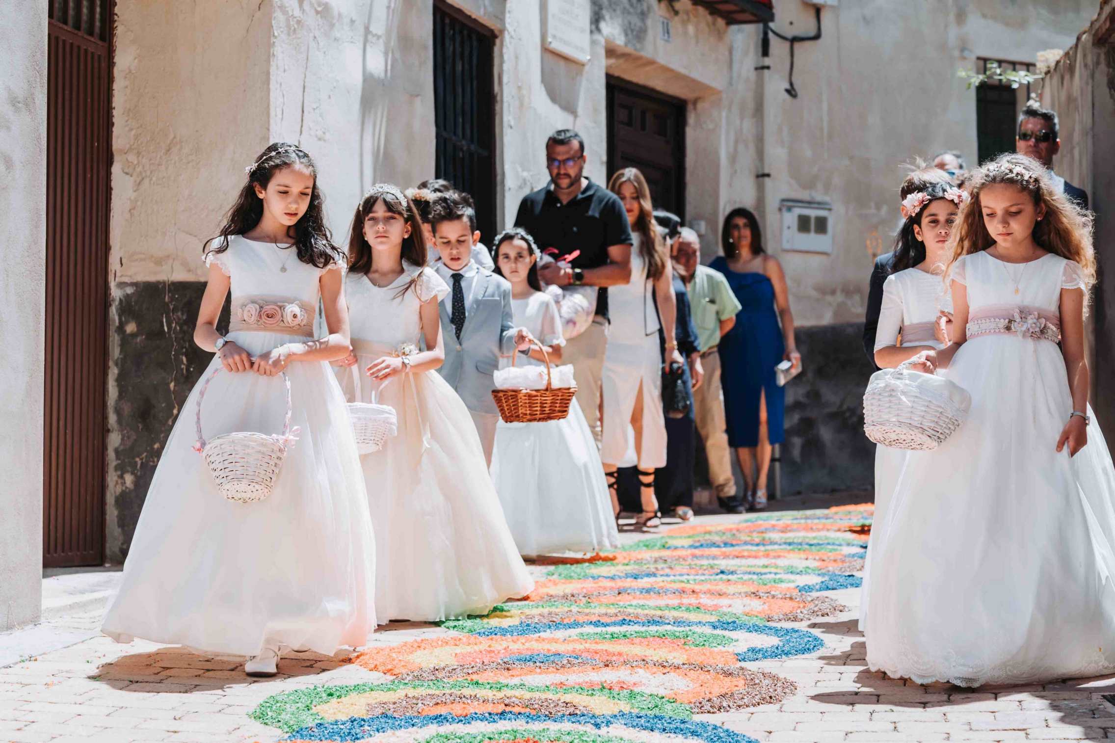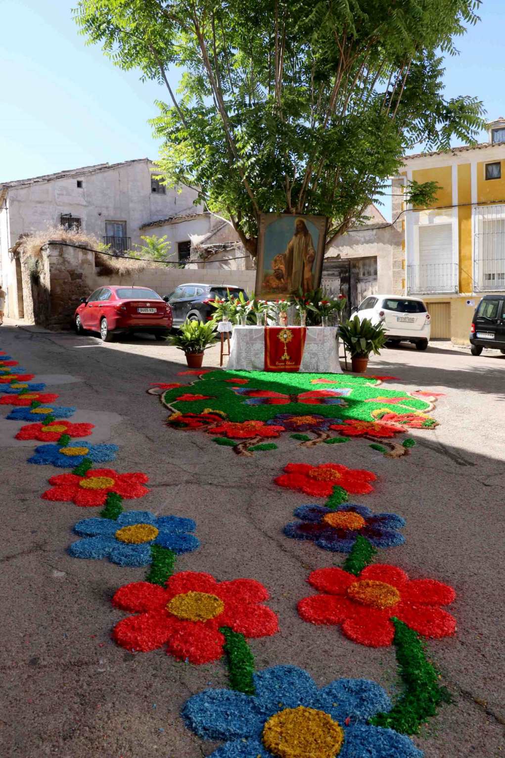 Uno de los mayores símbolos de esta fiesta son las alfombras florales que cubren el itinerario de la procesión. Vecinos y barrios se organizan durante días para teñir virutas, marcar dibujos y extender sobre el suelo más de tres toneladas de material coloreado, creando figuras geométricas, florales y religiosas con una riqueza cromática que deslumbra a quienes lo contemplan.