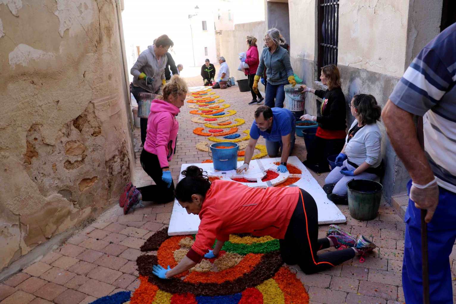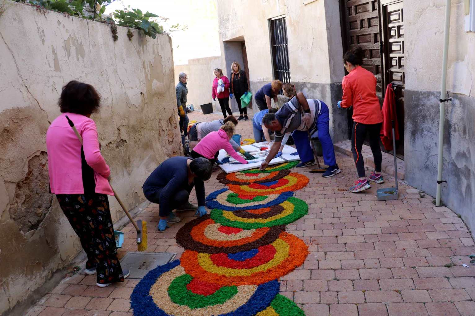 Desde la madrugada del domingo, el pueblo entero trabaja sin descanso para tener listas las alfombras con las primeras luces del día. Los visitantes más tempraneros acuden para admirar, cámara en mano y corazón en vilo, el momento mágico de su creación, e incluso se suman a los trabajos.