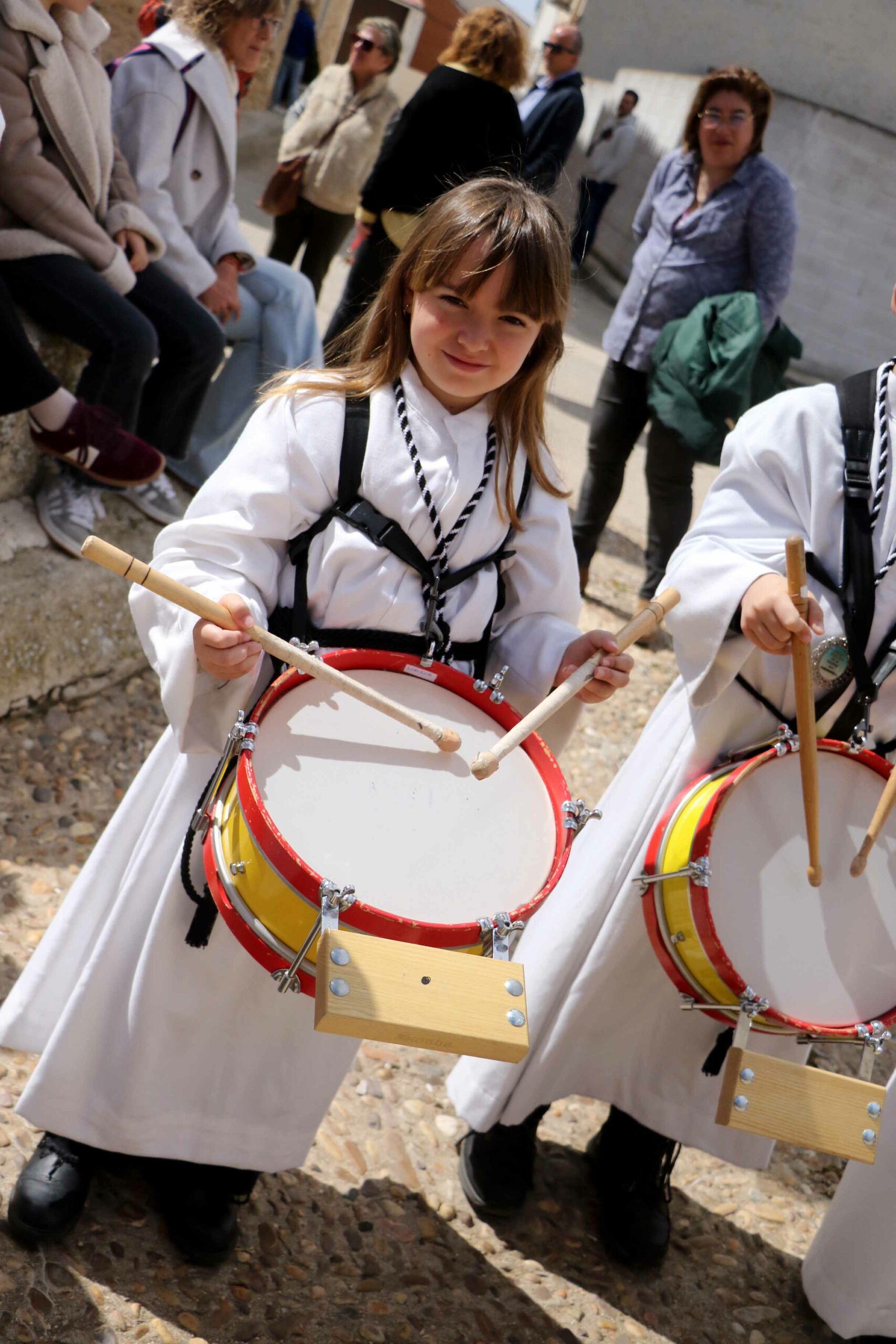 Isabel Alarcón, una de las integrantes de la Banda de Cornetas y Tambores de Fuentenovilla, Cofradía Virgen de la Soledad, que protagoniza el evento, hacía sonar la llamada, a la que seguían los redobles de sus compañeros.