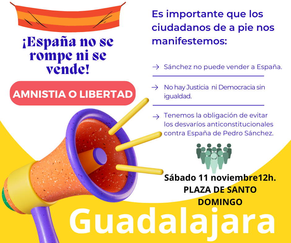 Llegaban ayer a mis manos dos convocatorias de concentraciones para estos días, una para el sábado día 11- N a las 12h. en la Plaza de Santo Domingo de Guadalajara y otra para el sábado 18-N en la plaza de Cibeles de Madrid. La del sábado en Guadalajara ha surgido espontáneamente de la sociedad civil guadalajareña harta ya de ver como se está vendiendo y rompiendo España, y lleva el lema de “Amnistía o Libertad”. La de Cibeles por otro lado lleva el lema de “No en mi nombre: ni Amnistía, ni autodeterminación, por la libertad, la unidad y la igualdad”.