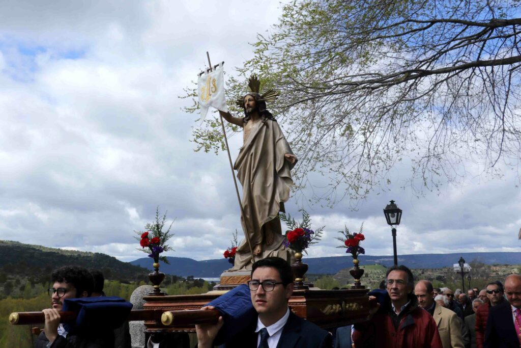 Hoy, poco antes de la una de la tarde, el párroco local, Javier Lucía, hacía sonar de nuevo las campanas de la Iglesia de la Asunción de Pareja, cuyas dos puertas permanecían abiertas para acoger la tradicional Procesión del Encuentro. Antes de celebrarse el oficio religioso, que dirigía el párroco local, Javier Lucía, desde el interior del templo, partían dos comitivas: una, por la magnífica Puerta del Sol, verdadero balcón sobre La Alcarria desde Pareja, con los hombres portando la imagen de Jesús Resucitado; la otra, por la Puerta Norte, con las mujeres y la imagen de la Virgen de la Soledad. Ambas tallas, de los años 50 del pasado siglo —pues las originales desaparecieron en la Guerra Civil— estaban listas para protagonizar uno de los momentos más esperados de la Pascua parejana. El cielo, con nubes y claros, ha permitido la celebración de la procesión, a diferencia de lo que ocurriera el año pasado, cuando hubo de hacerse en el interior del templo.