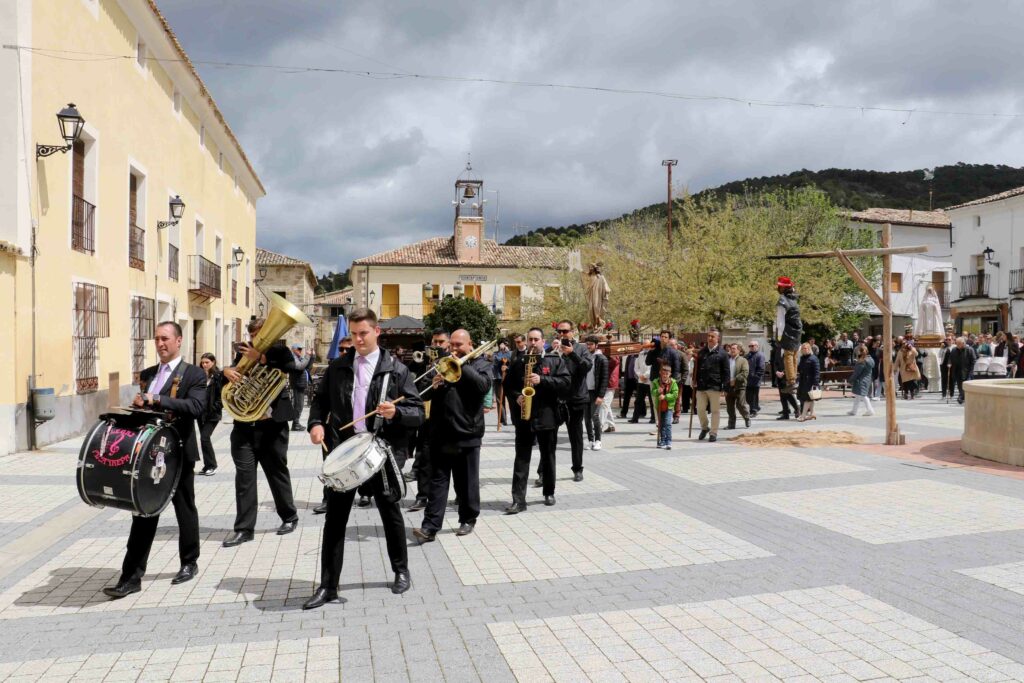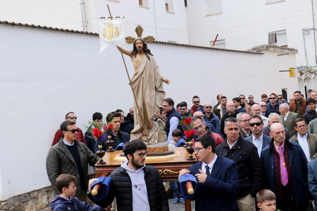 Como es tradición, la procesión comenzaba con los cánticos que invitan a hombres y mujeres a tomar las imágenes a hombros: “Venid mujeres piadosas con ilusión y alegría; pasearemos triunfante a la princesa María…” “Coged, mozos, la bandera, el estandarte y la Cruz; las mujeres a María, y los hombres a Jesús…”