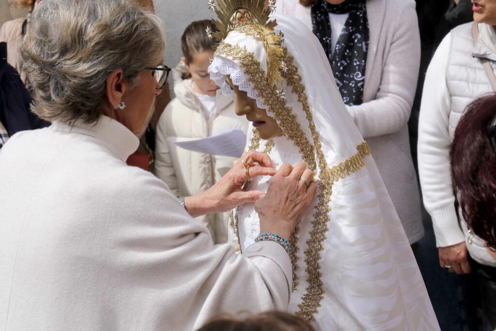 El Encuentro tuvo lugar en la emblemática calle Alegría, esquina con la calle Hospital. Allí, una voluntaria de la Asociación Cultural y de la Mujer, María José Alcocer, retiró el luto a la Virgen, al tiempo que se entonaban los versos que conmemoran la Resurrección: “Quitadle el manto de luto y ponedle el de color, cantemos con alegría que ha resucitado Dios…”