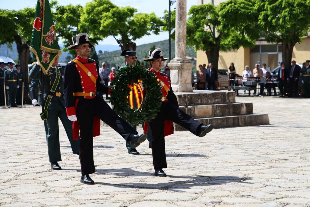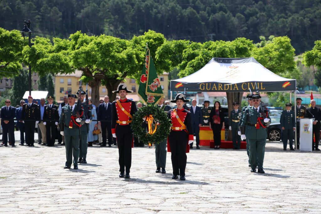 En la parte final del homenaje, se ha procedido a la ofrenda de una corona de laurel en honor a todos los guardias civiles que sirvieron con lealtad, murieron con honor y entregaron su vida por España. Antes del tributo floral, se leía un sentido poema que culminaba con los versos: “Por la patria morir fue su destino, querer a España su pasión eterna, servir en este cuerpo su vocación y sino. No quisieron servir a otra bandera, no quisieron andar otro camino, no supieron vivir de otra manera.” Tras el depósito de la corona, la escuadra de gastadores ha disparado una salva de honor, y el acto ha concluido con la interpretación del himno de la Guardia Civil.