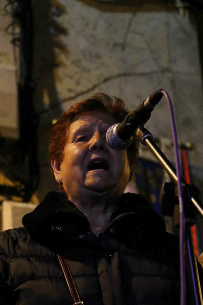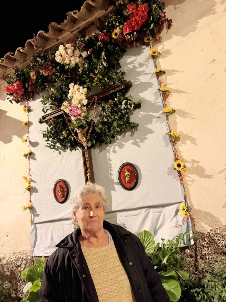 Una vez se inició el recorrido por las cruces, la primera parada fue en la calle de las Monjas, donde Mercedes Jabonero, su principal impulsora, recordaba cómo su hijo le construyó una cruz hace años, siguiendo una costumbre que ya mantenía su padre. “La vestimos todos los años. Ahora me ayudan, porque yo ya no me puedo subir a hacerlo”, contaba emocionada. La decoración de este año, principalmente vegetal, incluía cuadros antiguos, un angelito y dos pequeños espejos. Mercedes también elaboró limonada que compartió con los vecinos durante la noche.