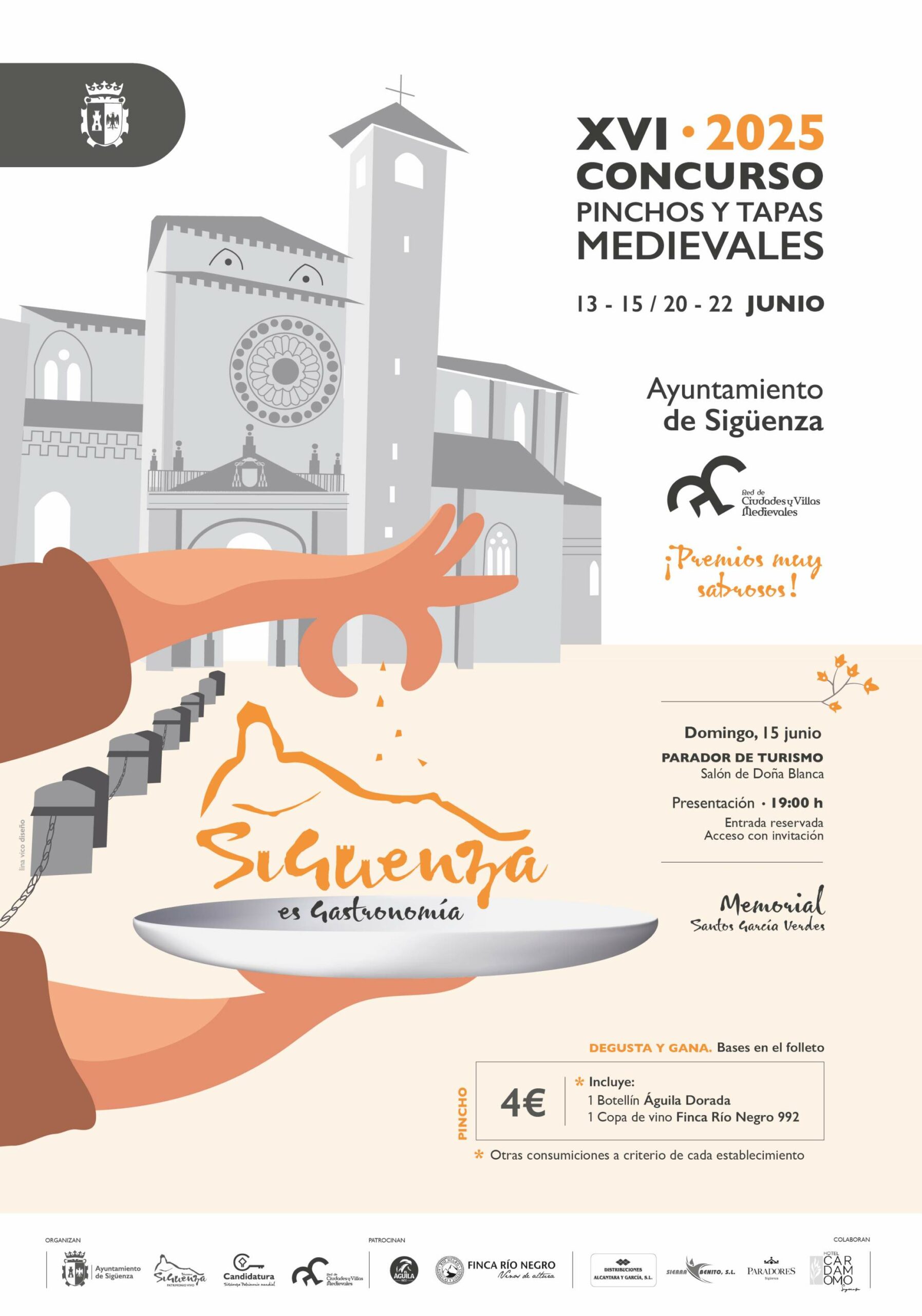 Cada pincho, cuidadosamente elaborado, será valorado por el público y por un jurado profesional. El establecimiento ganador representará a Sigüenza en la final del Concurso Internacional de Pinchos y Tapas Medievales, que este año se celebrará en Almazán (Soria). Lo organiza, anualmente, la Red de Ciudades y Villas Medievales a la que pertenece Sigüenza. La final local en la Ciudad del Doncel tendrá lugar el domingo 15 de junio a las 19:00 h en el Parador de Turismo (Salón de Doña Blanca), en un evento con showcooking y cata.