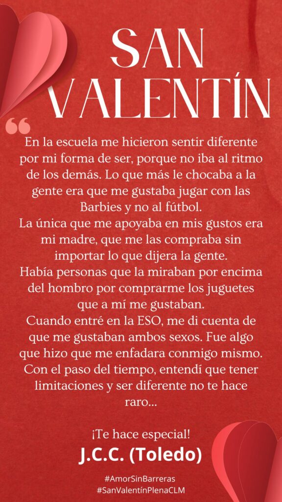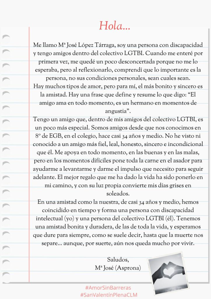 Plena inclusión Castilla-La Mancha impulsa la campaña «Amor sin barreras», una iniciativa cuyo objetivo ha sido visibilizar y celebrar historias de amor, amistad y apoyo dentro del colectivo LGTBI+ y de las personas con discapacidad intelectual o del desarrollo en el marco de celebración de San Valentín.