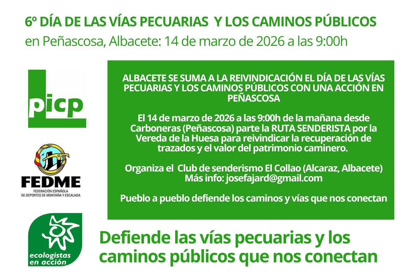 El próximo domingo, día 22 de marzo se celebra el 6º Día de las Vías Pecuarias y de los Caminos Públicos en toda la geografía española, realizándose al menos 7 rutas en las localidades Castellano Manchegas de las distintas provincias: Orgaz en Toledo, Malagón y Villarubia de los Ojos en Ciudad Real, Cuenca Alberca del Záncara en Cuenca. Cifuentes en Guadalajara. En Peñascosa, Albacete, se celebró dicho Día reivindicativo adelantado. Además, se ha organizado para el sábado 21 el IV Foro de Conocimientos Ecológicos Tradicionales en Cardenete. El día de las Vías Pecuarias surgió por iniciativa de la PICP en 2019, para contribuir a la protección de estas antiquísimas vías ganaderas y del rico patrimonio natural, cultural que atesoran.