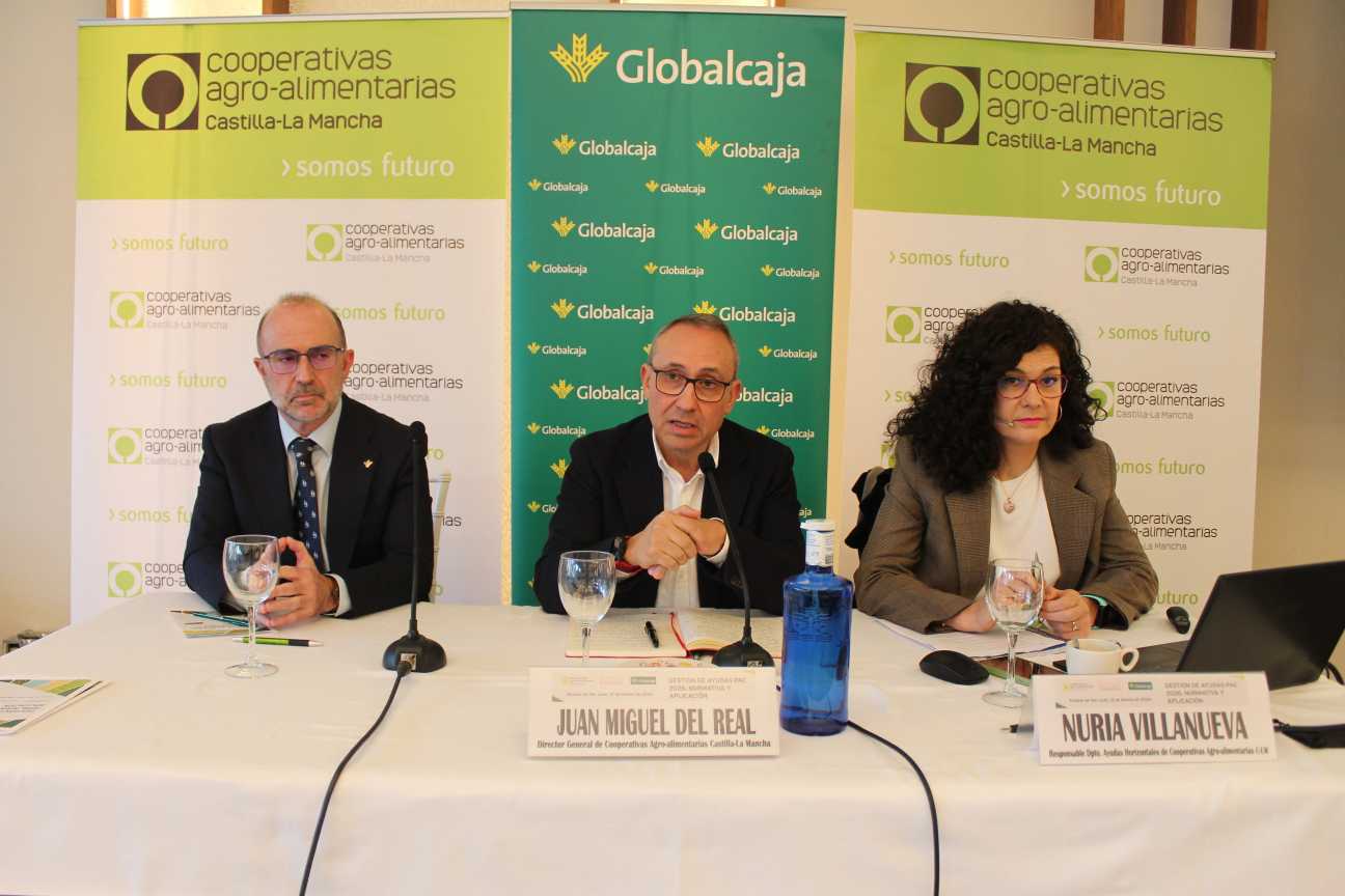 Bajo el título “Gestión de ayudas PAC 2026. Normativa y aplicación”, la jornada ha sido inaugurada por Juan Miguel Del Real, director general de Cooperativas Agro-alimentarias Castilla-La Mancha, Rafael Mendoza, responsable de PAC y Ayudas Agrarias de Globalcaja, y Nuria Villanueva, responsable del Departamento de Ayudas Horizontales de esta entidad.