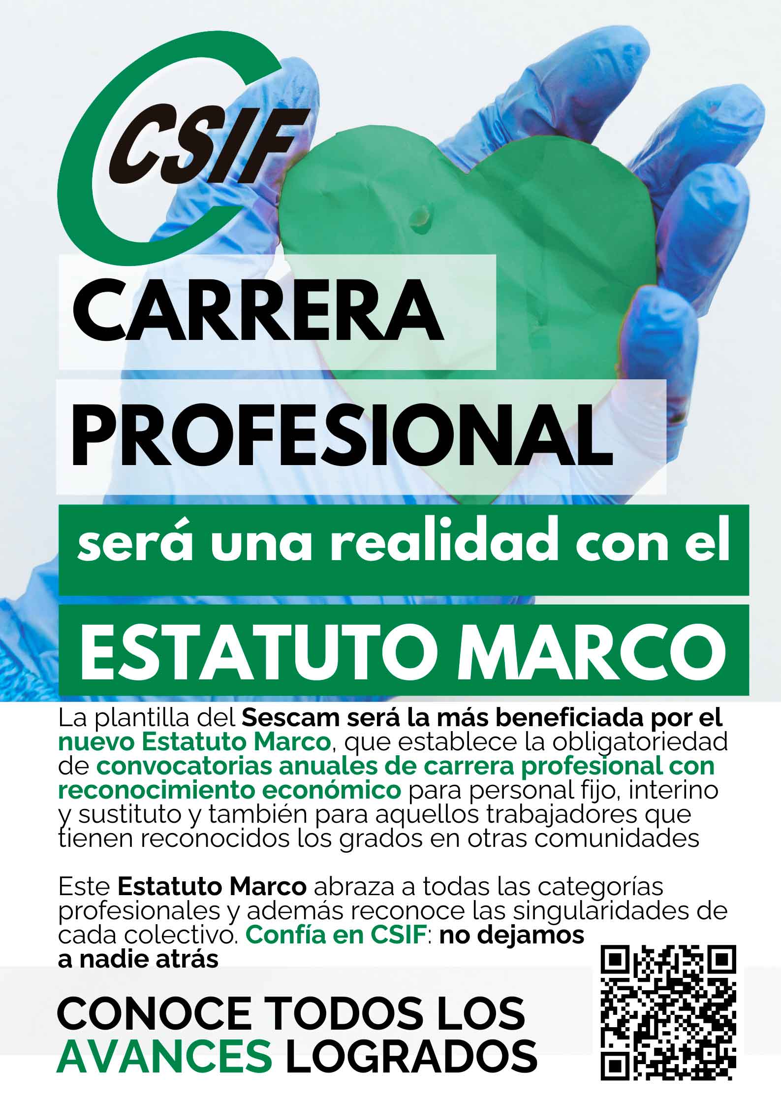 CSIF señala que el anteproyecto de Ley del Estatuto Marco, firmado el pasado el pasado 26 de enero por CSIF con el Ministerio de Sanidad, beneficiará especialmente a los trabajadores del Sescam, porque permitirá recuperar la carrera profesional, ya que obligará a las comunidades autónomas a realizar convocatorias cada año. Será una realidad para el personal fijo, interino y sustituto y también para aquellos trabajadores que tienen reconocidos los grados en otras comunidades.