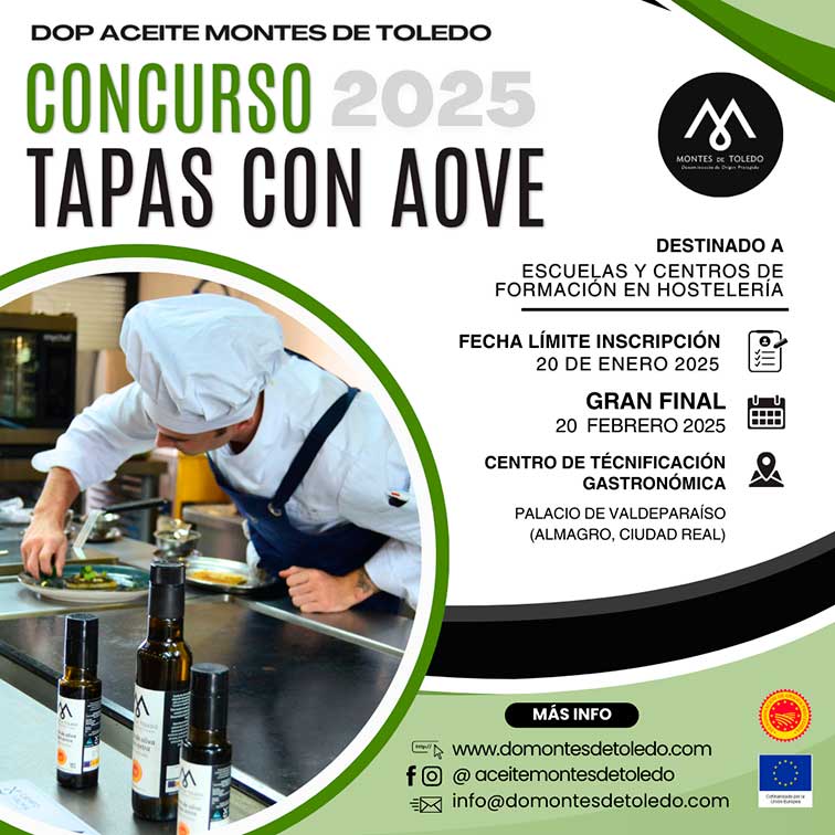 El Consejo Regulador de la Denominación de Origen Protegida (DOP) Aceite Montes de Toledo organiza la segunda edición Concurso “Cocina con AOVE DOP Montes de Toledo”, en este caso en formato ‘tapas’, dirigido al alumnado de las escuelas y centros de formación en hostelería.