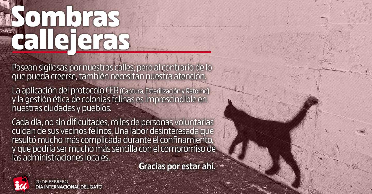 Tampoco voy a desaprovechar la ocasión para poner de manifiesto una vez más la necesidad de llevar a cabo protocolos CER (captura, esterilización y retorno) en los municipios donde haya colonias felinas. En muchos pueblos y ciudades ya hay personas encargándose de ello y es necesario que desde las instituciones públicas se subvencione, organice y coordine este tipo de actuaciones que benefician a todas las partes implicadas. Seguiremos trabajando desde Izquierda Unida allá donde estemos para que así sea.